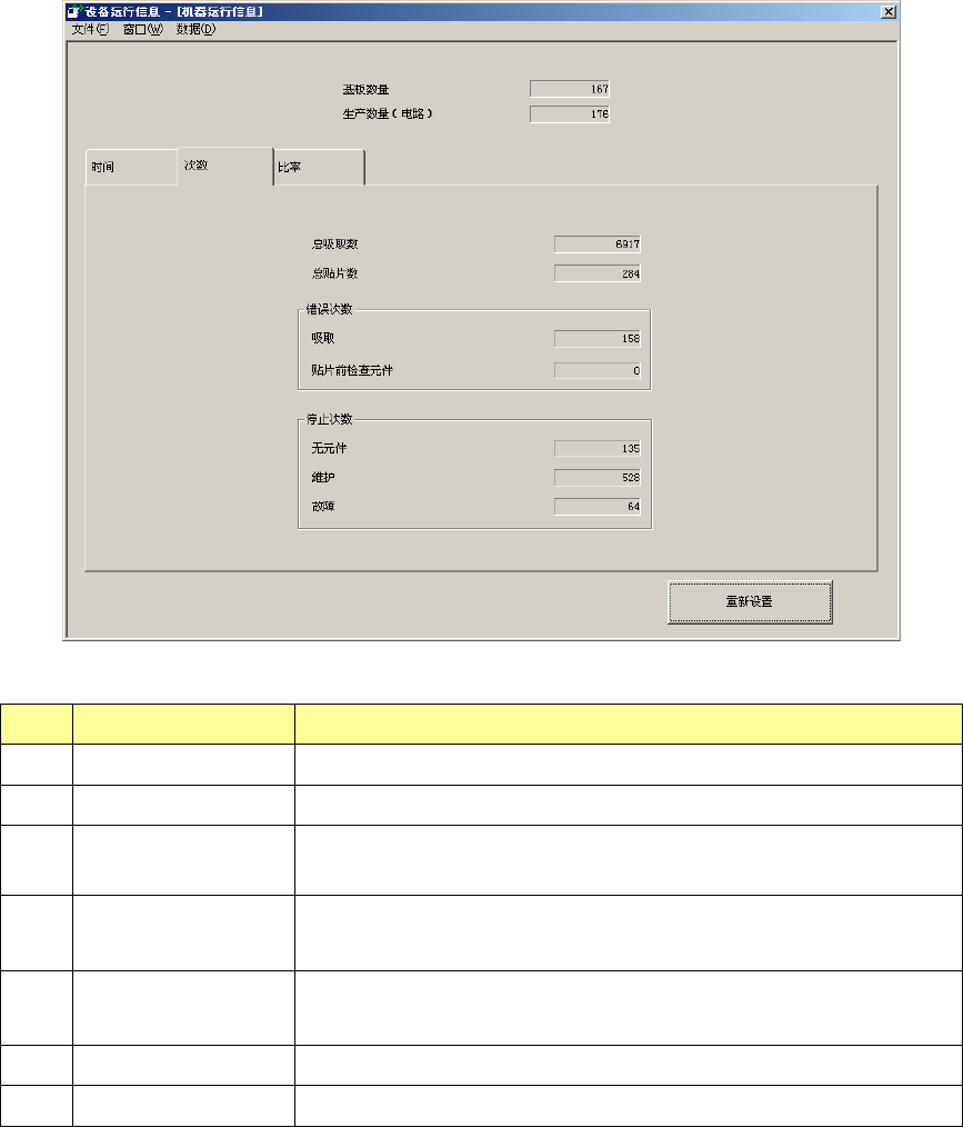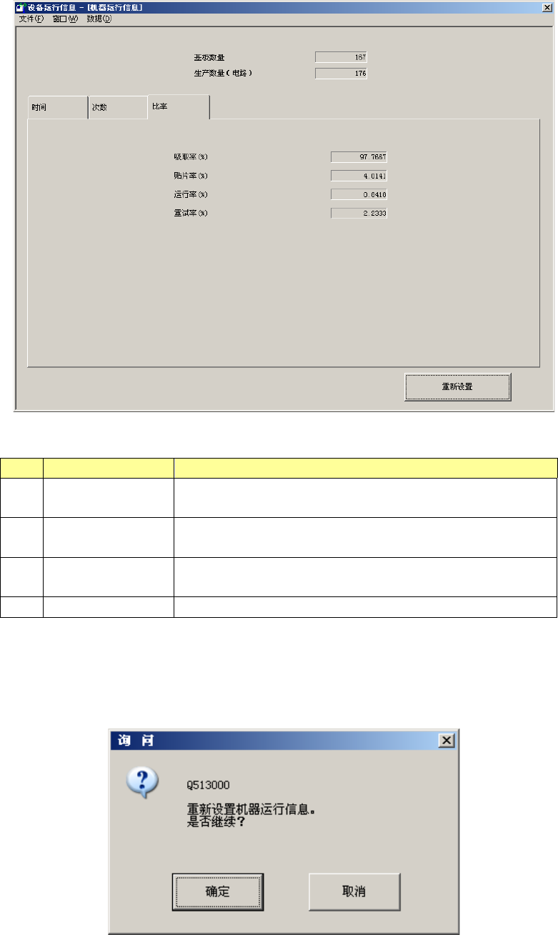 第 2 部 功能详解篇 第 10 章 设备运行信息 10 -5 (3 ) 比率 在机器运行信息 画面内点击 [ 比率 ] 选项卡后,可 显示机器运行 信息 ( 比率 ) 画面。表内项目如 下。 No. 项目 内容 1 吸取率 元件的吸取率 (%) [ 总吸取数 ] /( [ 总吸取数 ]+[ 吸取错误次数 ] )× 1 00(%) 2 贴片率 机器的实际贴片 率 (%) [ 总贴片数 ] /( [ 总贴片数 ]+[ 贴片错误次数 ] )…