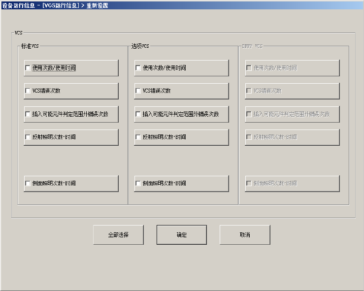 第 2 部 功能详解篇 第 10 章 设备运行信息 10 - 23 10 -4- 7 VCS 运行信息 选择下拉菜单中的 [ 窗口 (W)] - [VCS 运行信息 ] ,或在命令按钮中选择 [VCS 运行信息 ] ,可显 示 VCS 运行 信息画面。 (1) VCS No. 项目 内容 1 使用次数 使用 VCS 的次数累计。 2 使用时间 使用 VCS 的时间累计。 3 VCS 错误次数 VCS 发生错误次 数累计。 4 插入可能元…
