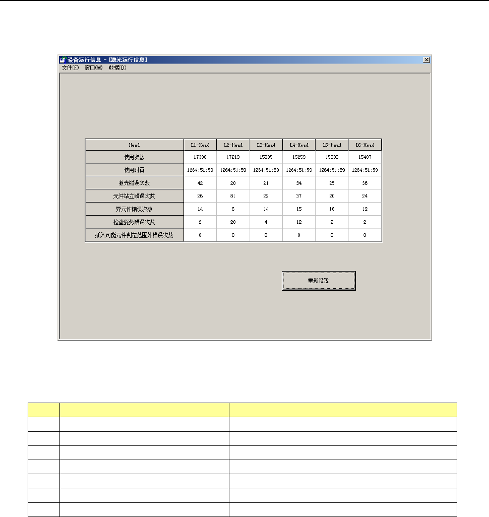 第 2 部 功能详解篇 第 10 章 设备运行信息 10 - 33 10 -4- 12 激光运行信息 从下拉菜单中点 击 [ 窗口 (W)] -[ 激光运行 信息 ] , 或从命令 按钮中选择 [ 激光运行信息 ] 后, 可显示 “ 激光运 行 信息 ” 画面。 (1) 激光运行信息 No. 项目 内容 1 使用次数 使用激光的次数 累计。 2 使用时间 使用激光的时间 累计。 3 激光错误次数 发生激光错误的 次数累计。 4 元件站立…