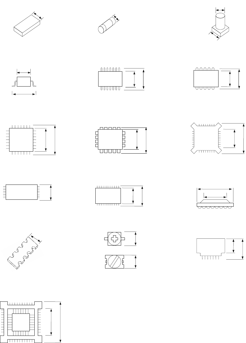 第 1 部 基本篇 第 1 章 装置概要 1- 18 (3) 各种 元件的最小元件宽 度 ( D ) 1 )方型芯片 2 ) 圆筒形芯片 3 ) 铝电解 电容 4 ) S OT 5 ) SOP 6 ) S OJ 7 ) QFP 8 ) PLCC 9 ) B QFP 10 ) TSOP 11 ) TSOP 2 12 ) BGA 13 ) 网 络电阻 14 ) 微 调电容 15 ) 单 向引脚连接器 16 ) 鸥翼式插座 、 J 引脚插座 …