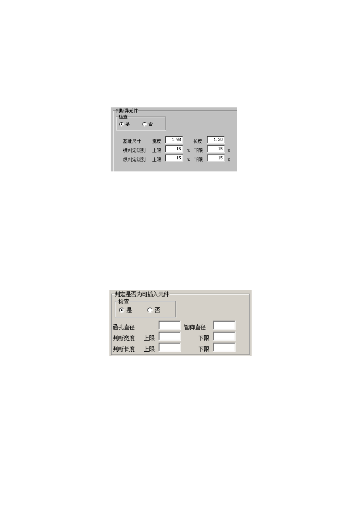 设定是否实施可插入元件判定,以及球径尺寸、管脚径尺寸、实施判定时的判定尺寸。