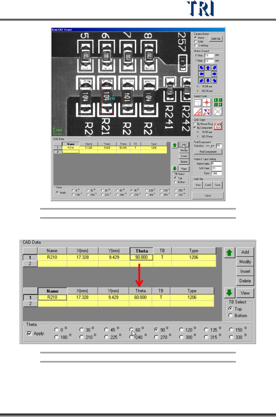 Test Research Inc. TR7500 Series User Guide – Software v.2.9.0 81 Figure 138 : Set Theta Data When Using Bo x Tool Select a [Theta] field and select an an g le to chan ge the data directly . Figure 139 : Edit Theta Ang l…