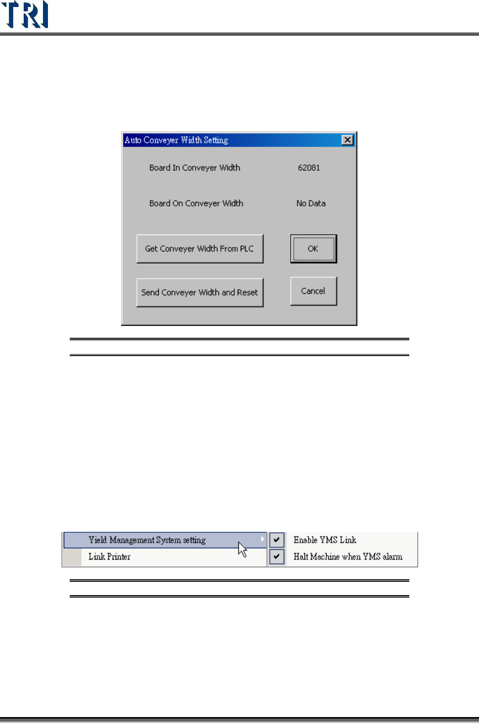 Test Research Inc. 114 TR7500 Series User Guid e –Softwa re v.2.9.0 [Cancel] – Cl ose the dialog. 3.10.26 Auto Conveyor Wid th Setting This dialog is to read the convey or width from PLC to the project or send the conv…