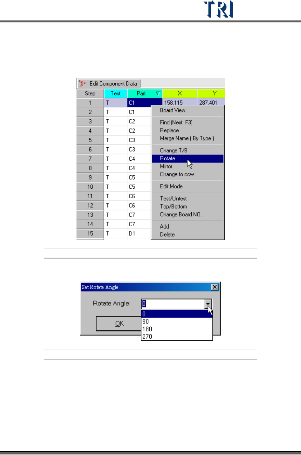 Test Research Inc. TR7500 Series User Guide – Software v.2.9.0 139 5.7 Rotate Rotate the board an g le to specific degree (from 0 ~ 360 deg ree). Figure 225 : Select Rotate C ommand Key in any value from 0-360 de g rees …