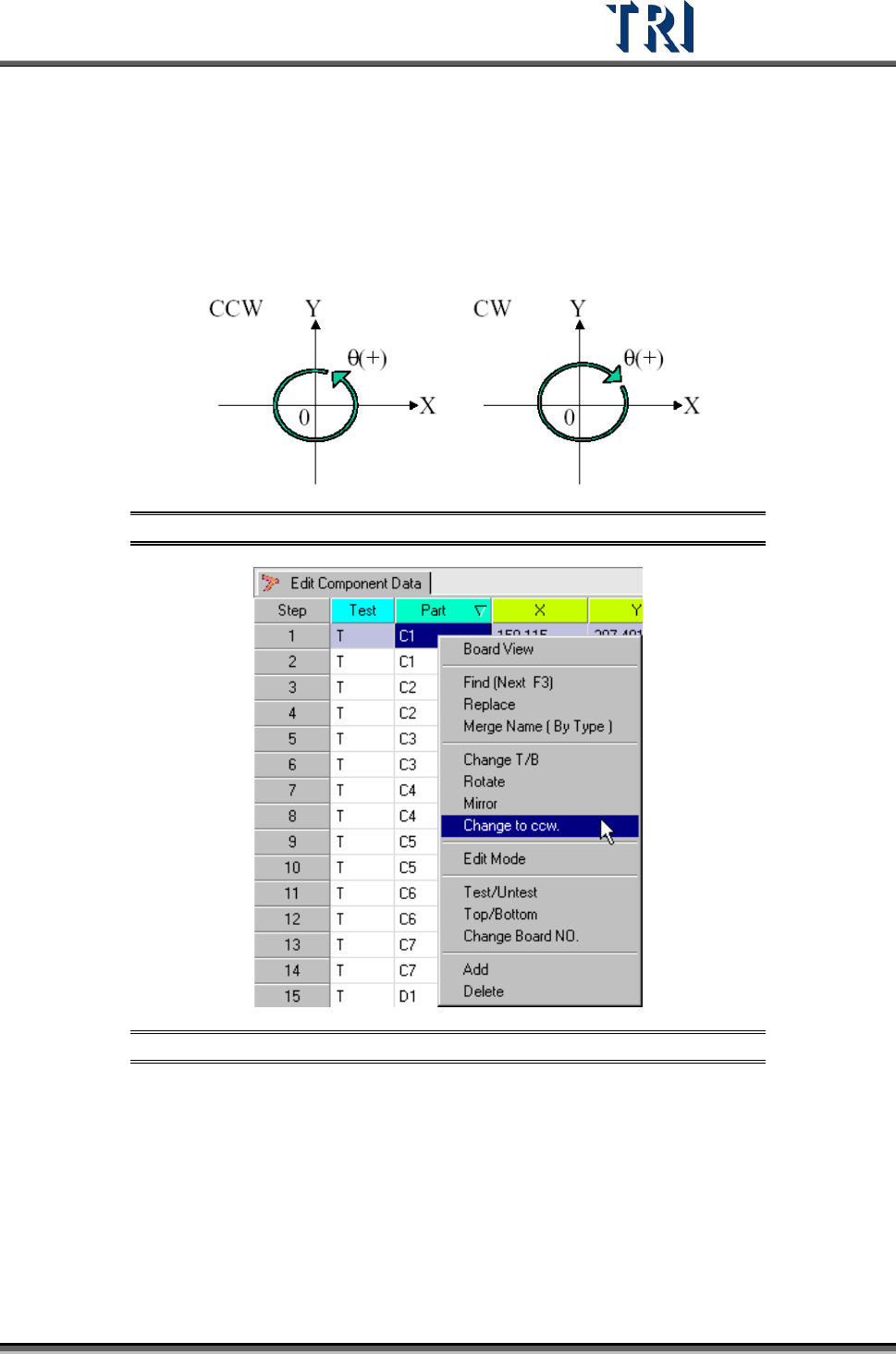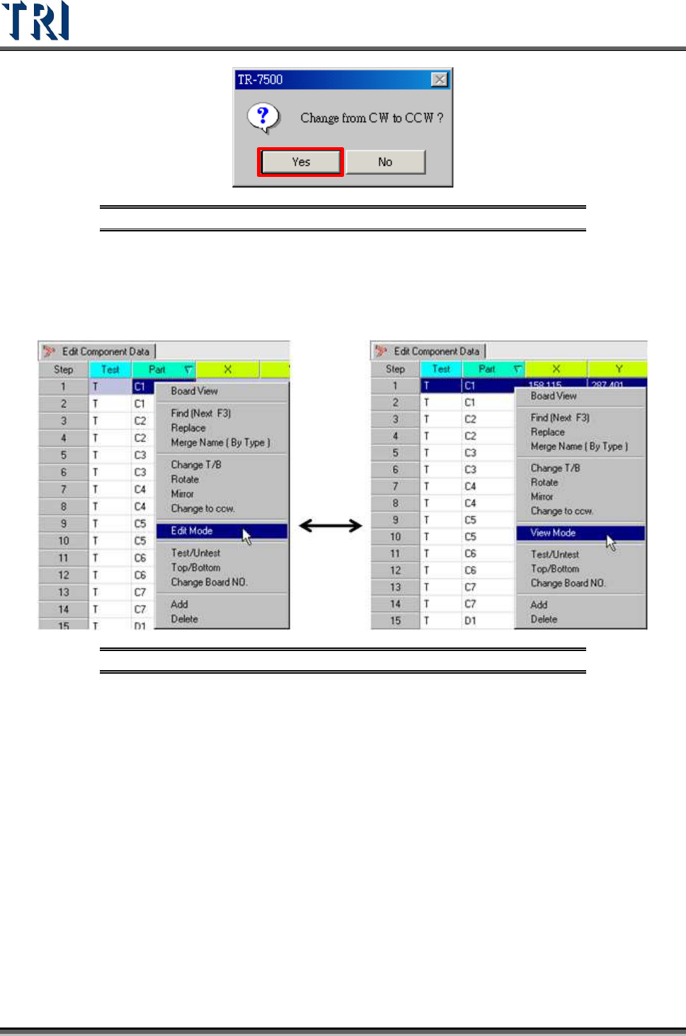 Test Research Inc. 142 TR7500 Series User Guid e –Softwa re v.2.9.0 Figure 231 : Change to CCW Confirm Win dow 5.10 Edit/ View Mode Change the [Compone nt Data] table f rom [View] mode to [Edit] mode. T he information o …