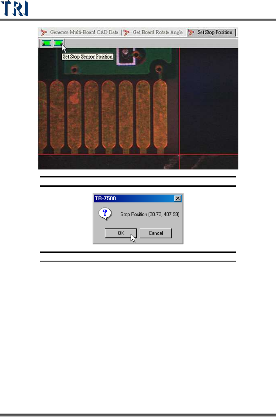 Test Research Inc. 158 TR7500 Series User Guid e –Softwa re v.2.9.0 Figure 263 : Set Stop Senso r Position Figure 264 : Confirm Stop Position 6.5.5 Board 1 Size Set board 1 siz e here. 6.5.6 Mosaic Press this function to…