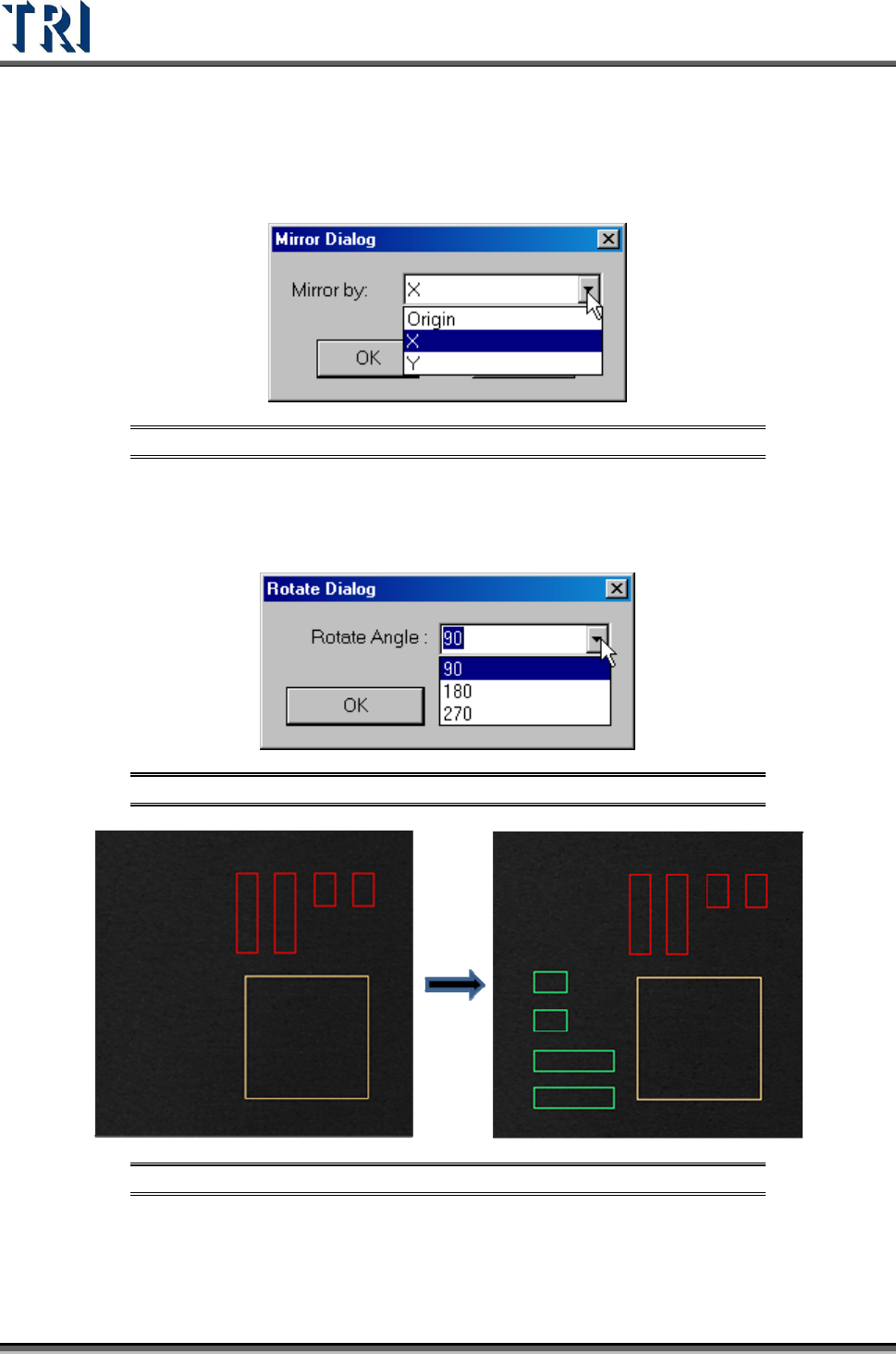 Test Research Inc. TR7500 Series User Guide – Software v.2.9.0 179 8.2.6 Rotate Sid e Rotate the pin direc t ion 90 de grees counterclockwi s e by clicking once. Figure 299 : Rotate Pin Dir ection Command Result 8.2.7 Ch…