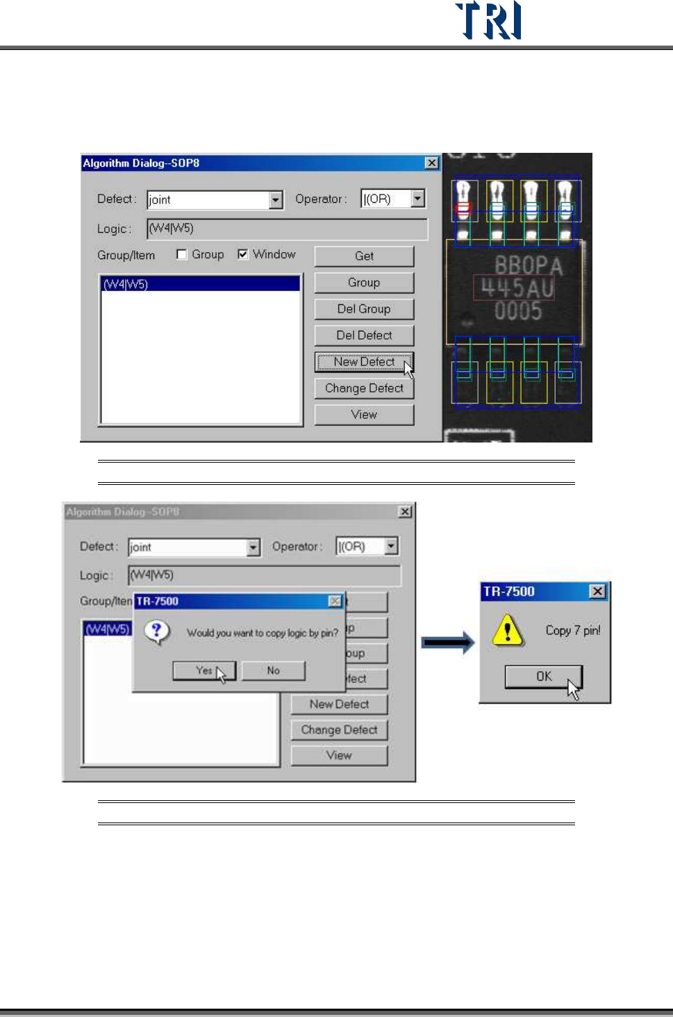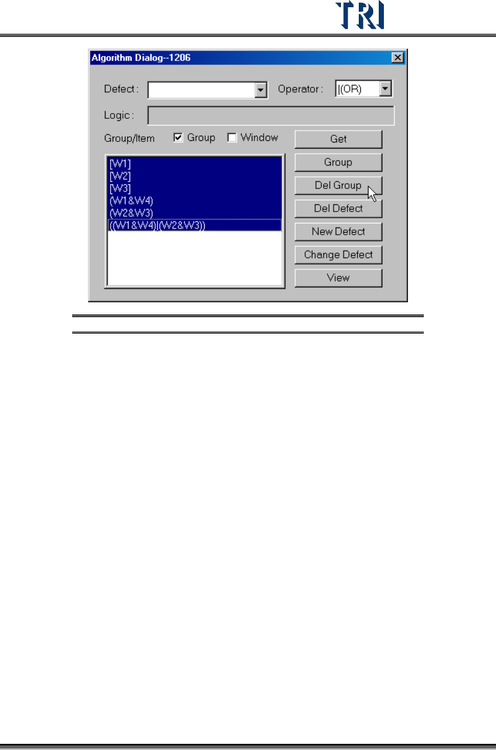 Test Research Inc. 202 TR7500 Series User Guid e –Softwa re v.2.9.0 [De l Defect] – Delete the defect logic output formula. Figure 340 : Delete Defect L ogic [Ne w Defect] – Create the new defect logic operatio n for…