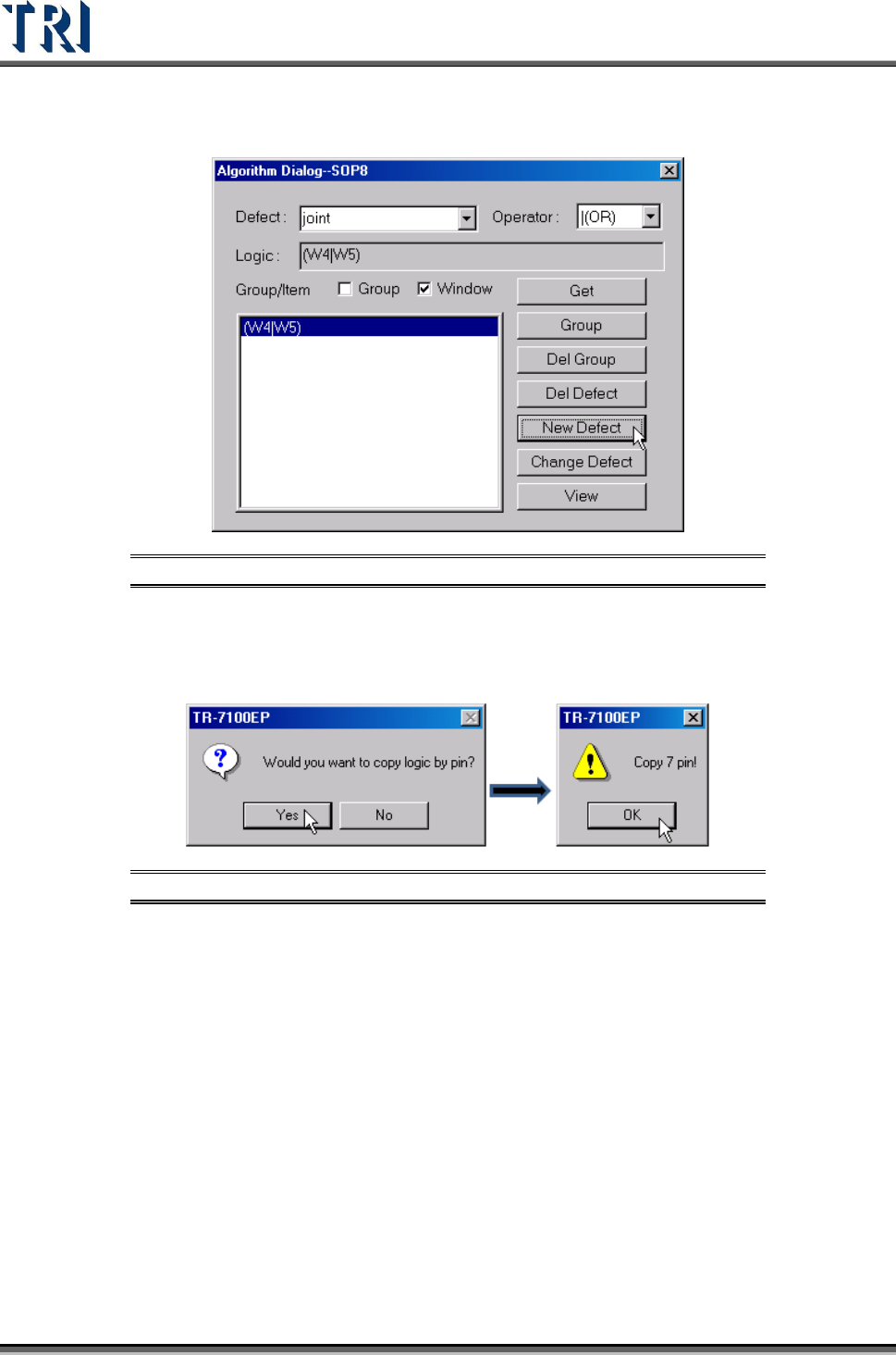 Test Research Inc. 206 TR7500 Series User Guid e –Softwa re v.2.9.0 Step4. Giv e the new logic setting a na m e, and input it in [ Defect] field. Then press [New Defect ] to create the new logic. Figure 348 : Add Name to…