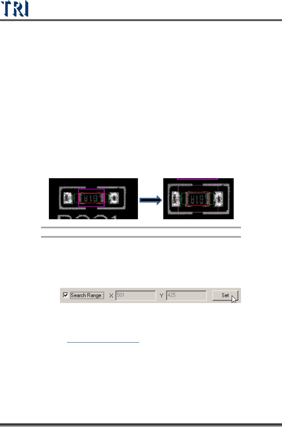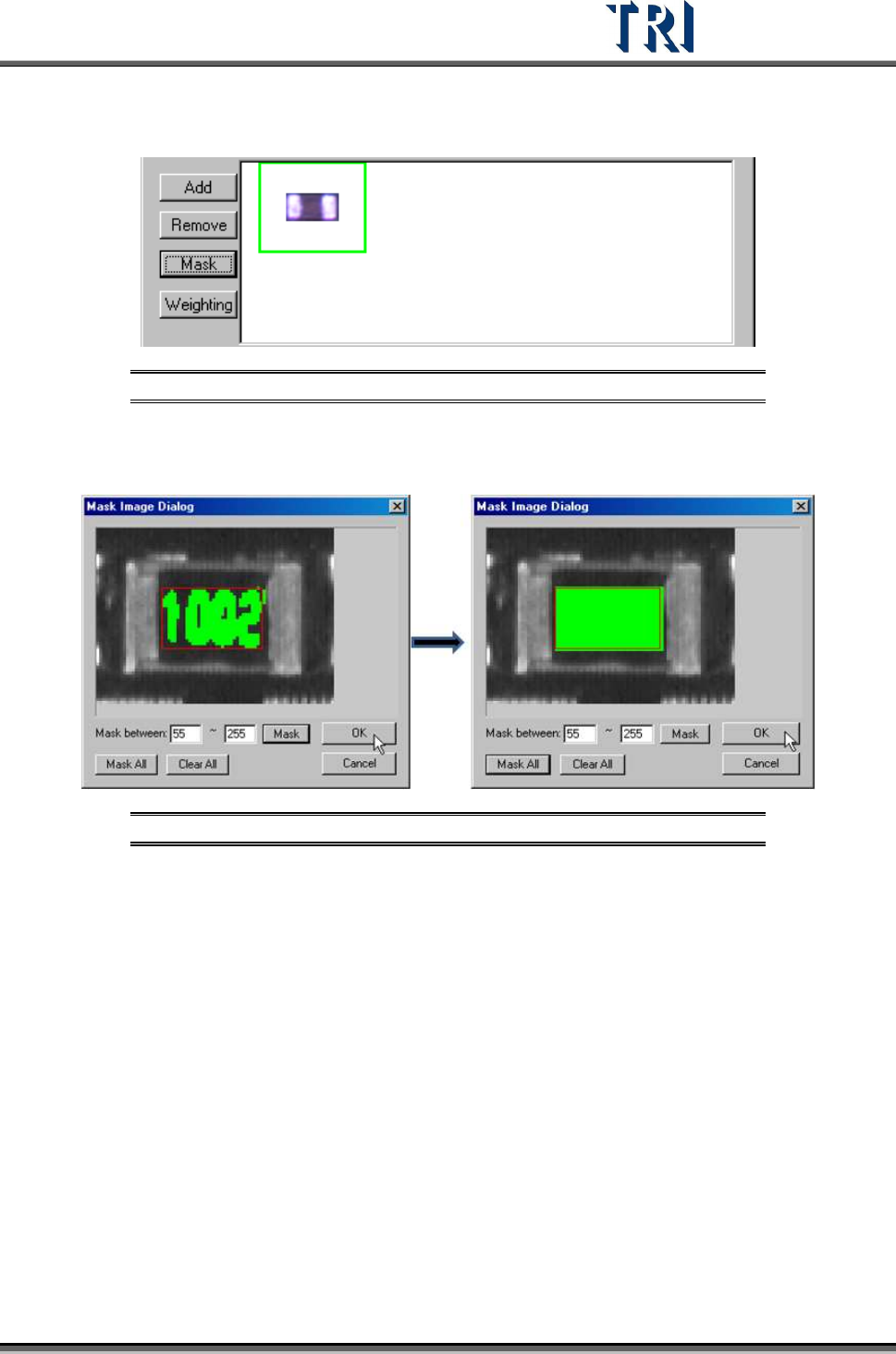 Test Research Inc. TR7500 Series User Guide – Software v.2.9.0 209 [M ask ] – Masks the co mponent image with a non-inspection area or non-r egular area for pattern search . A green frame appears i f a mask is set for …