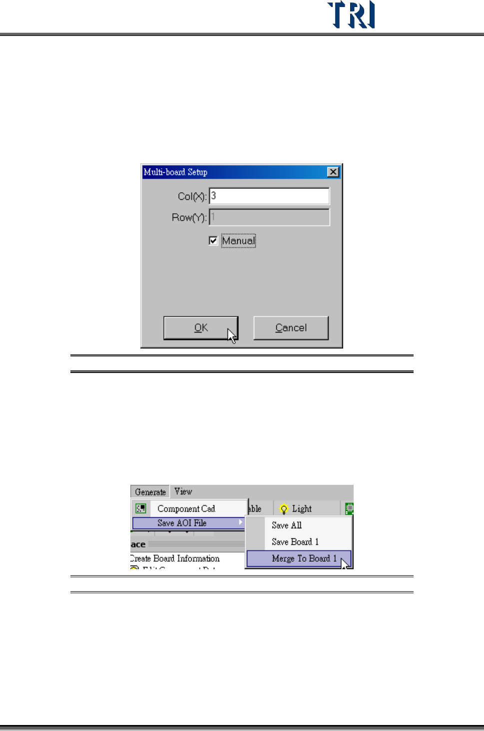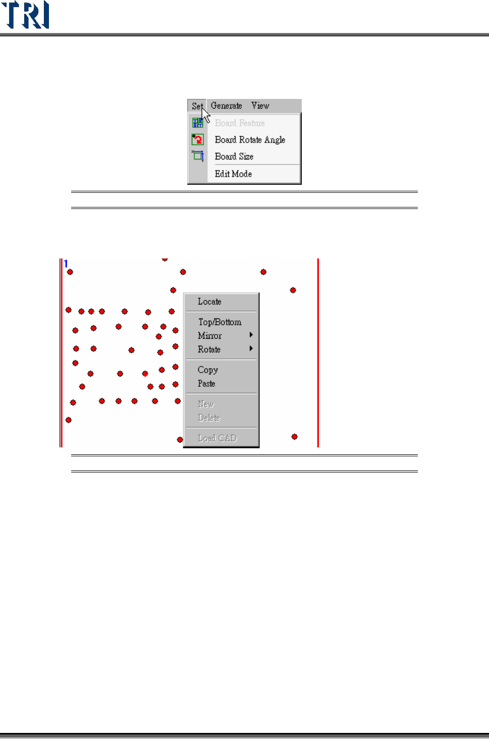 Test Research Inc. 242 TR7500 Series User Guid e –Softwa re v.2.9.0 Step1. Open a finished pro g ram. Step2. Enter [ATPG/Gener t e Multibo ard CAD Data]. Step3. Select [Set/Edit M ode] Figure 404 : Set Step4. Right click…