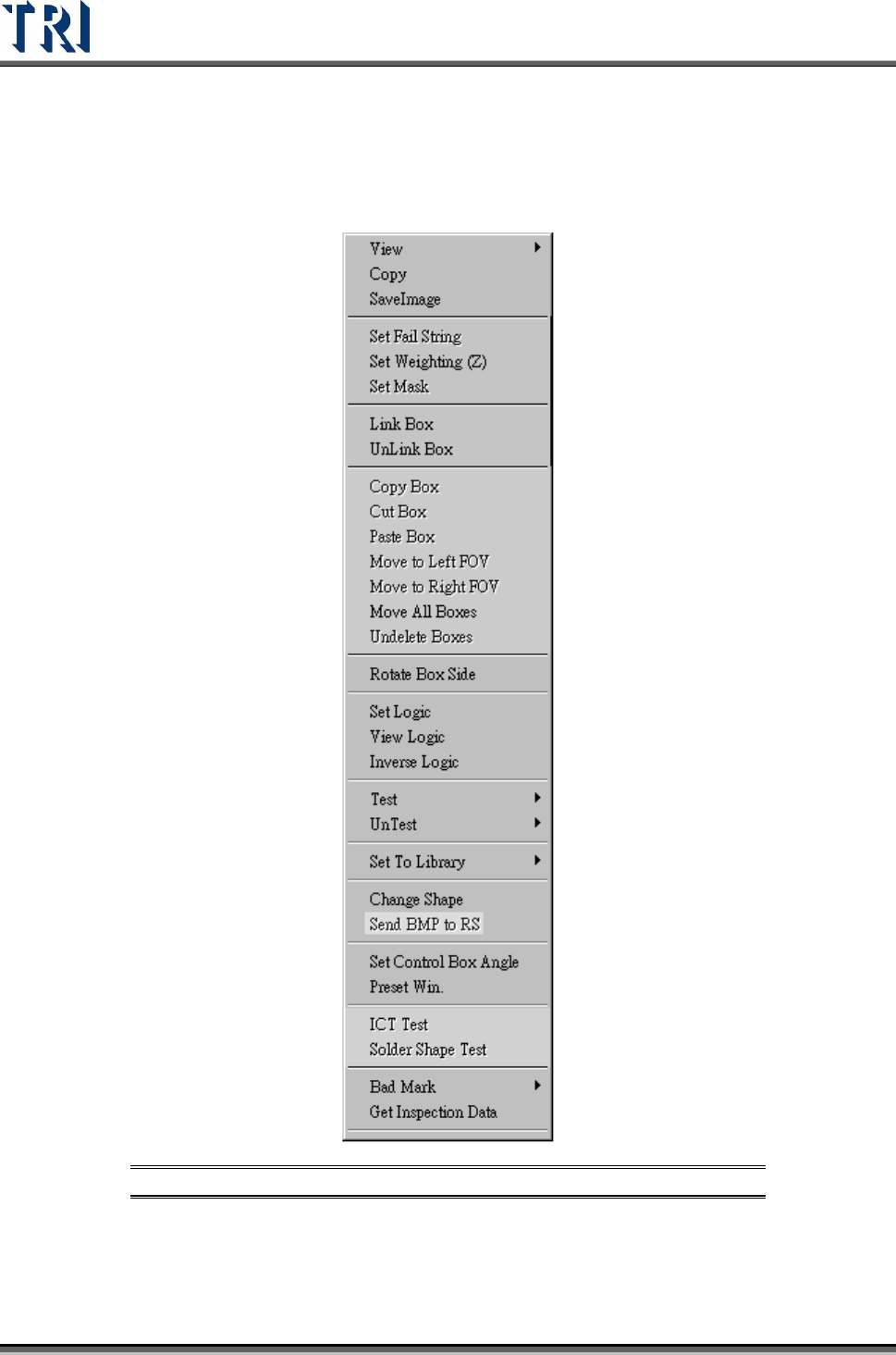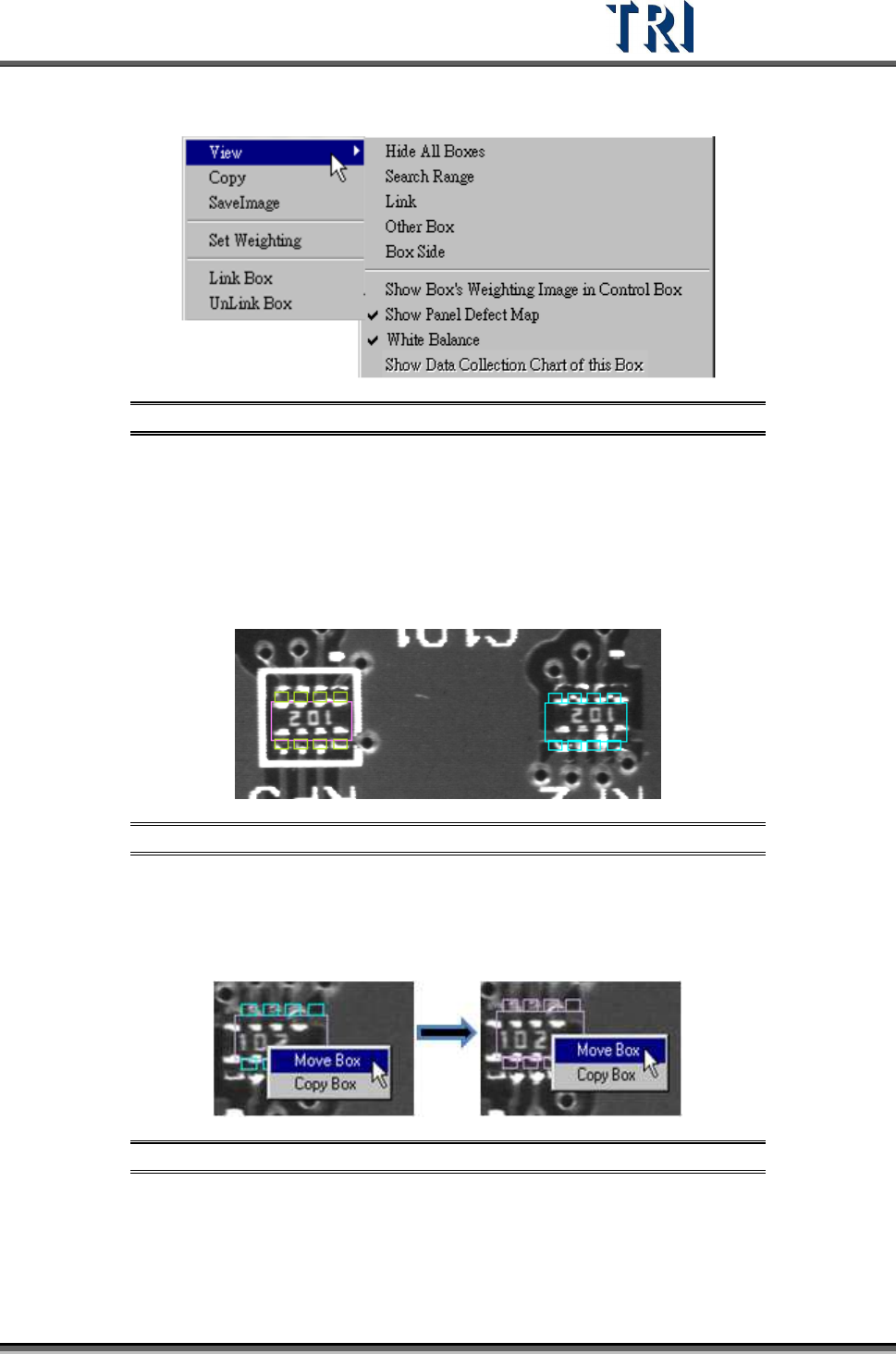 Test Research Inc. TR7500 Series User Guide – Software v.2.9.0 249 11.6.1 View Figure 414 : View Menu [Hide All Boxes] – Select this to hide all boxes in an FOV image. [Search Ran ge] – Select to show t he search ran…