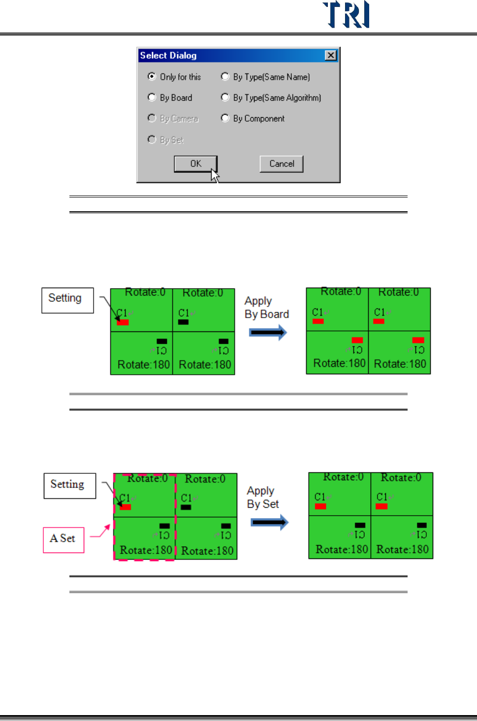 Test Research Inc. 262 TR7500 Series User Guid e –Softwa re v.2.9.0 [By Type (Same Name)] –The componen t with same type will be appli ed at the inspection box w ith same window name. [By Type (Same Algorithm)] –The …