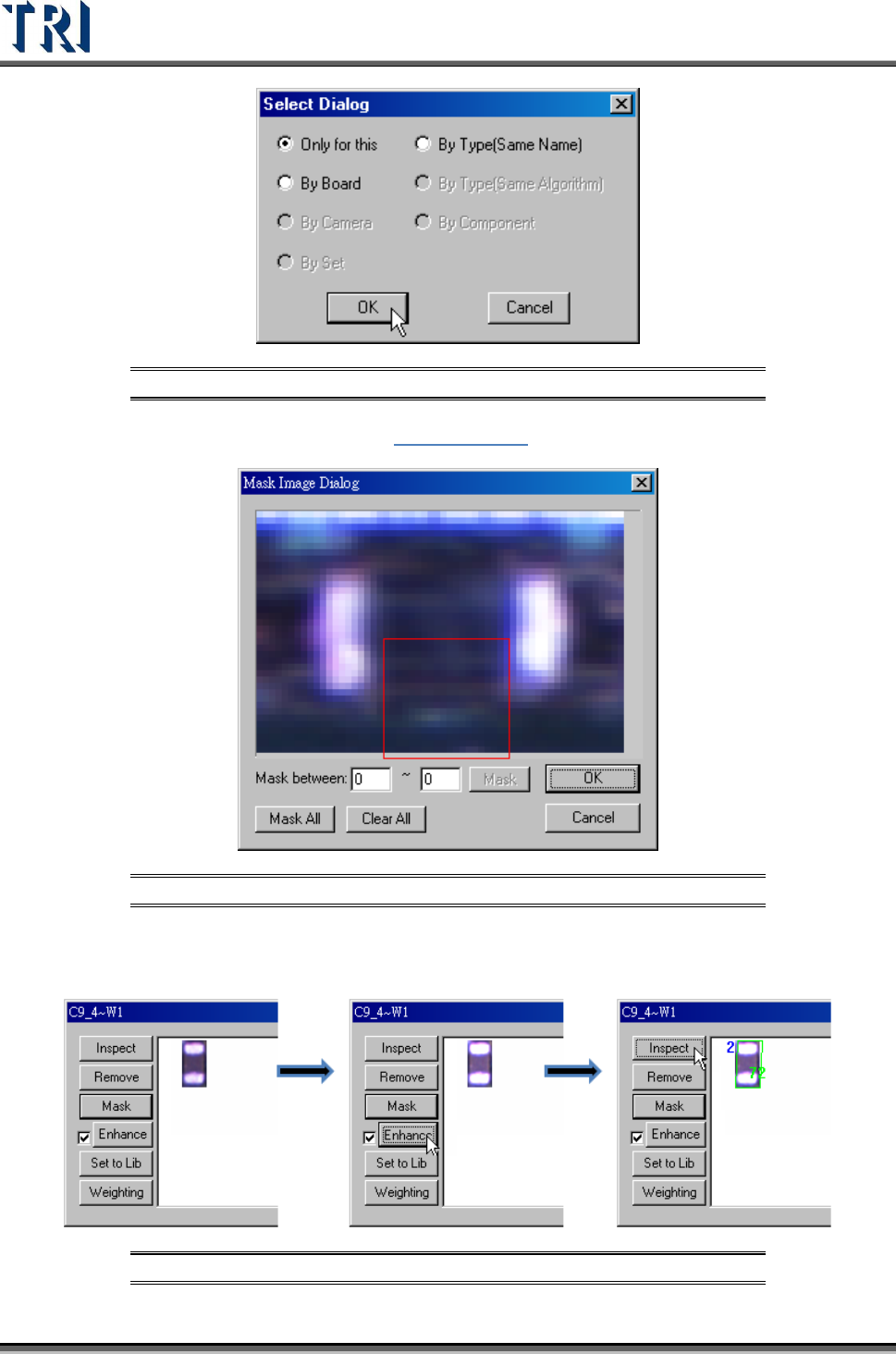 Test Research Inc. TR7500 Series User Guide – Software v.2.9.0 265 Figure 443 : View Standard Images [Inspect] – Review the similarity between the stan dard image and the image that is waiting to be measured . The blue…