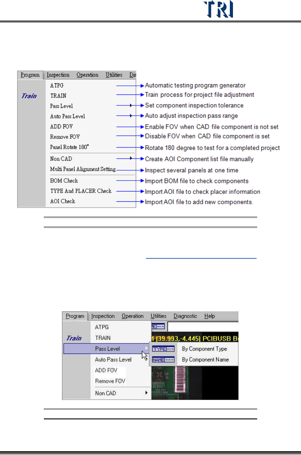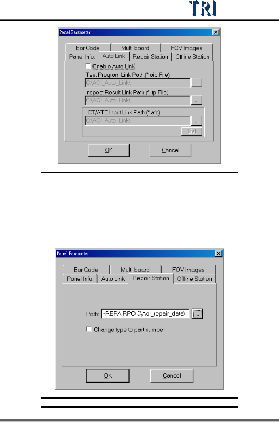 Test Research Inc. 60 TR7500 Series User Guide – Software v.2.9.0 [Path] – Set repai r data saving path for repair stati on. Default settin g is [\\RepairPC\C\AOI_Repa ir_Data]. [Change Type to Part Number ] – Choose…