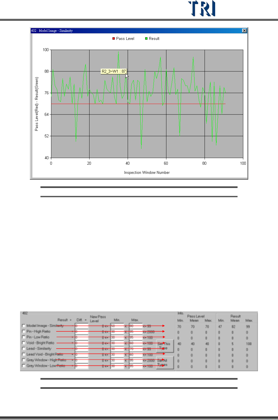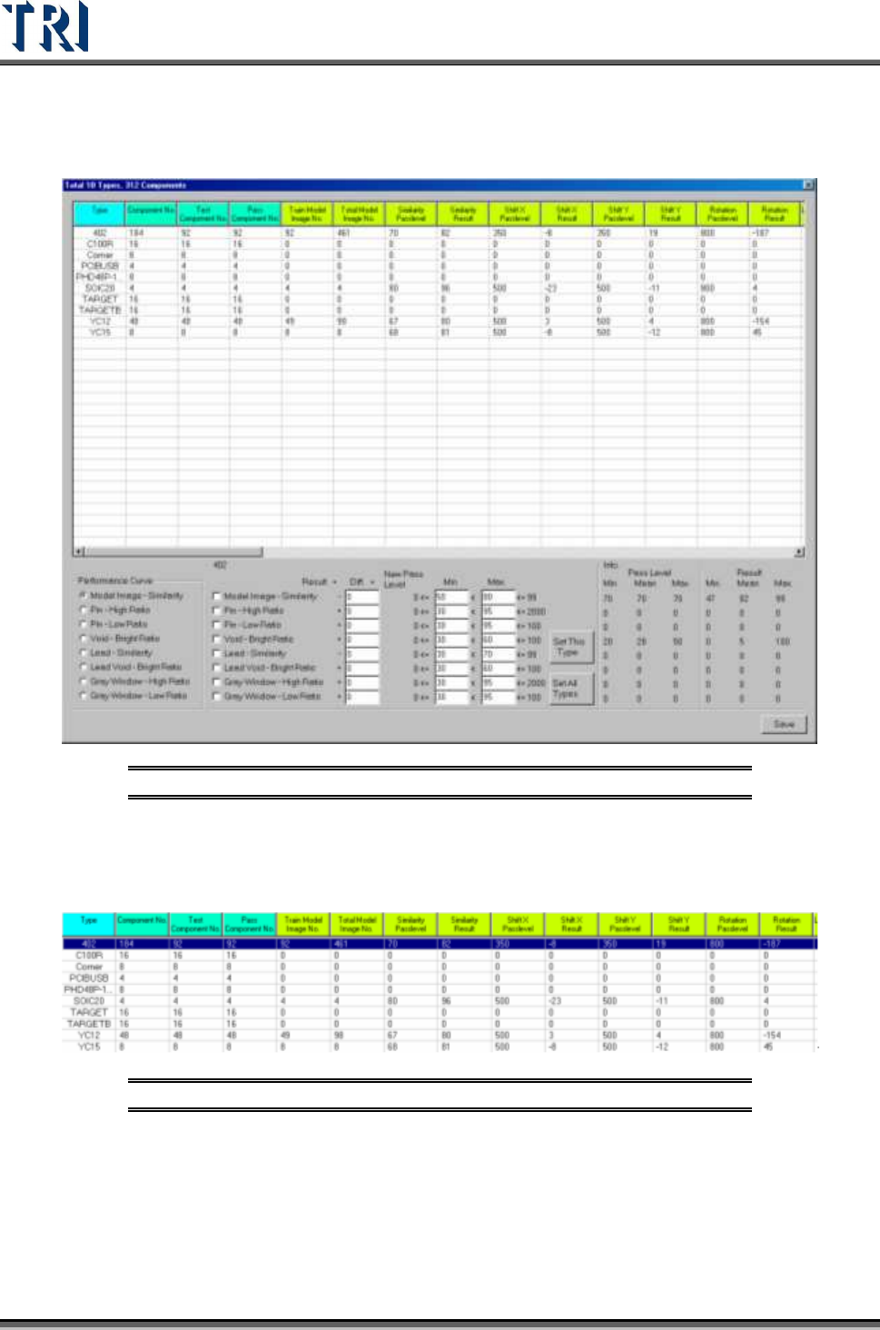 Test Research Inc. 62 TR7500 Series User Guide – Software v.2.9.0 3.4.3.1 By Component Typ e Set the pass lev el by component type. After selection the f ollowing w indow appears. Figure 110 : Sample Compo nent List In t…