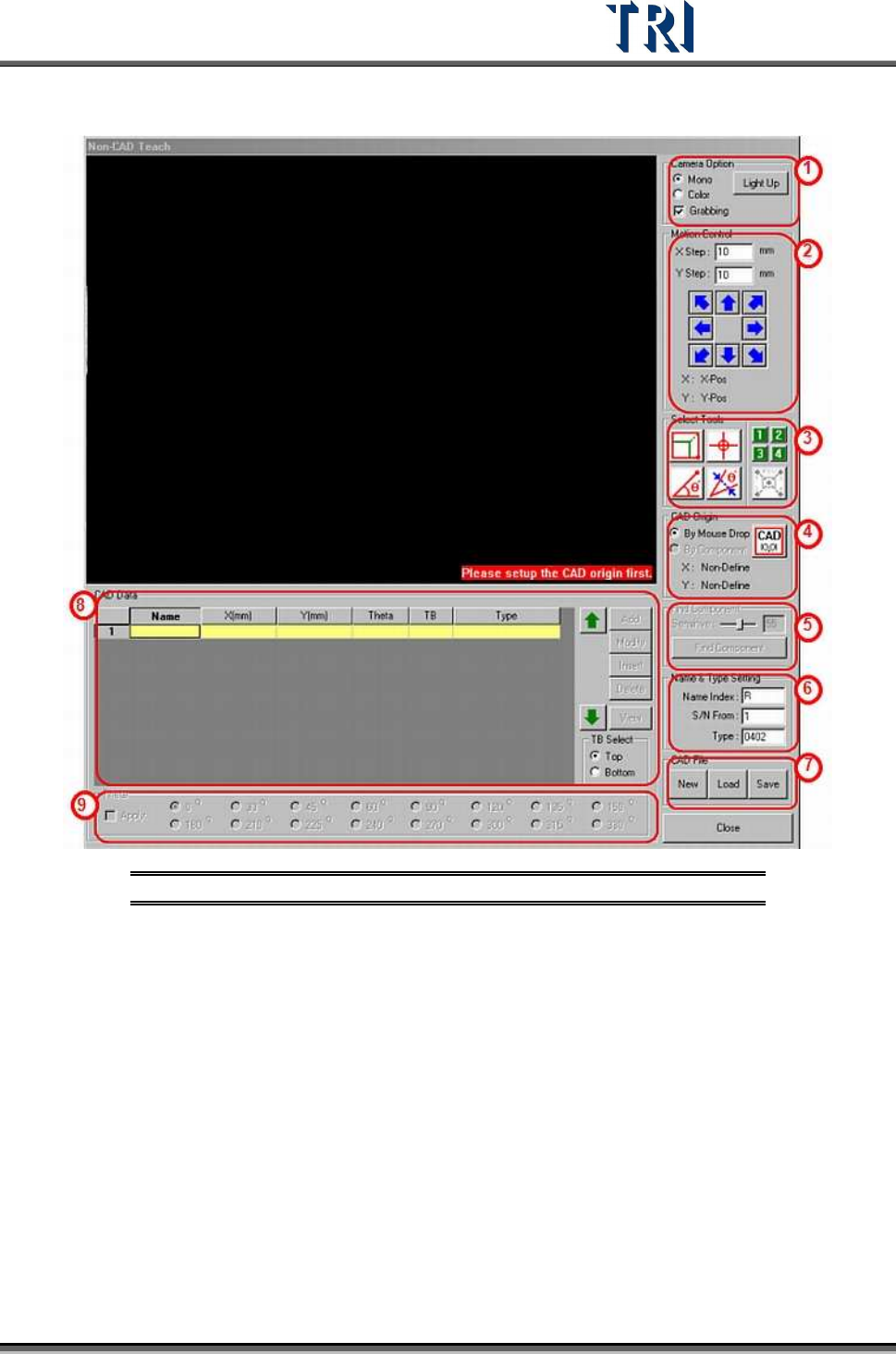 Test Research Inc. TR7500 Series User Guide – Software v.2.9.0 71 3.4.8.2 Non-CAD Teach I n terface Introd uction Figure 124 : Non-CAD Teach Window & Func tions (1) [Camera Option] - Ch eck [Grabbin g] to capture rea…