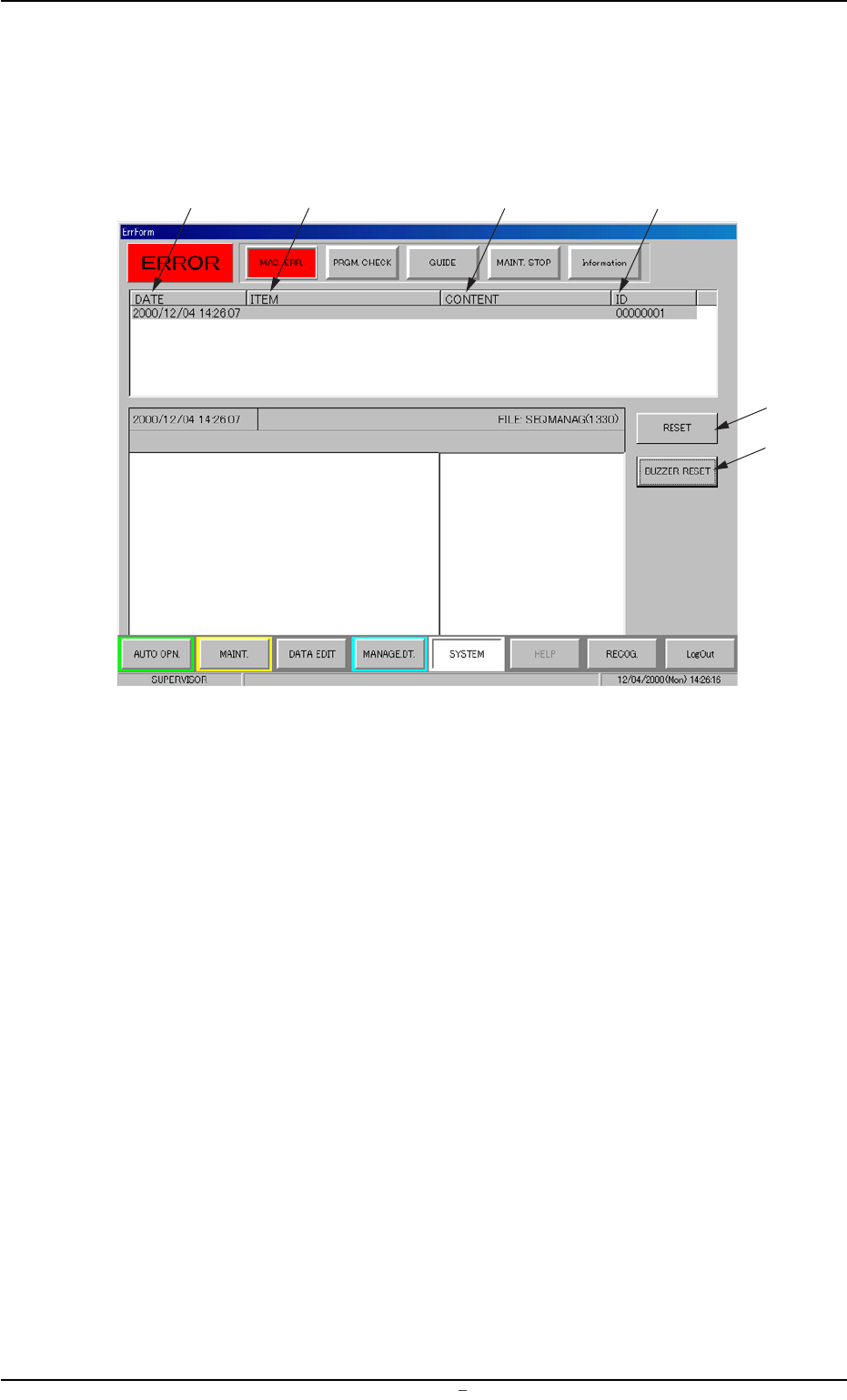 0009-002 Chapter 2 1 4 AFU01ETRP 1.1 "MAC. ERR." Window • Window Layout When an error is detected, the following "MAC. ERR." window opens. Fig. 4A2 Example of "MAC. ERR." Window • Window Com…