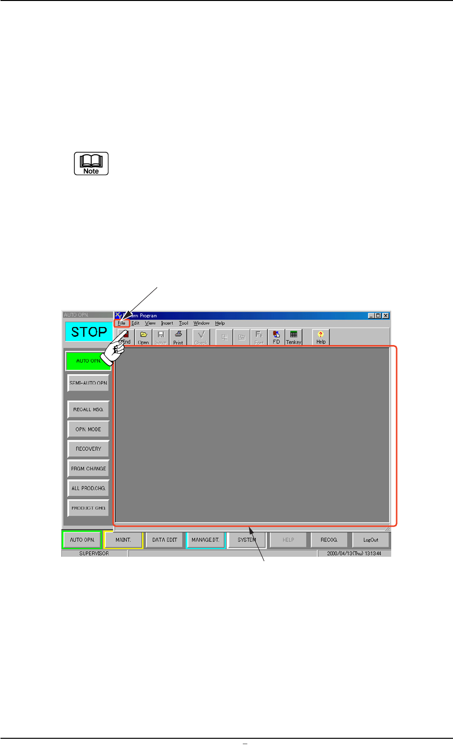 (2) Press "File" on the menu bar . The pull-down menu opens. Select "New Prgm." or "Open..." from the pull-down menu. New Prgm. : Select this to newly create a pattern program. Open... : Sel…