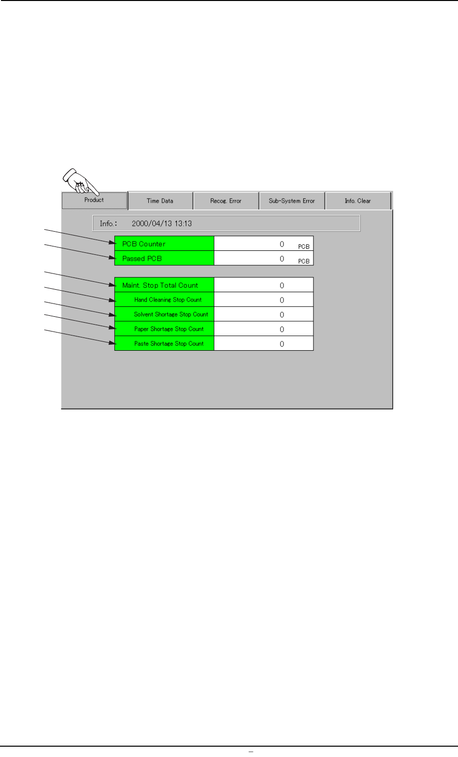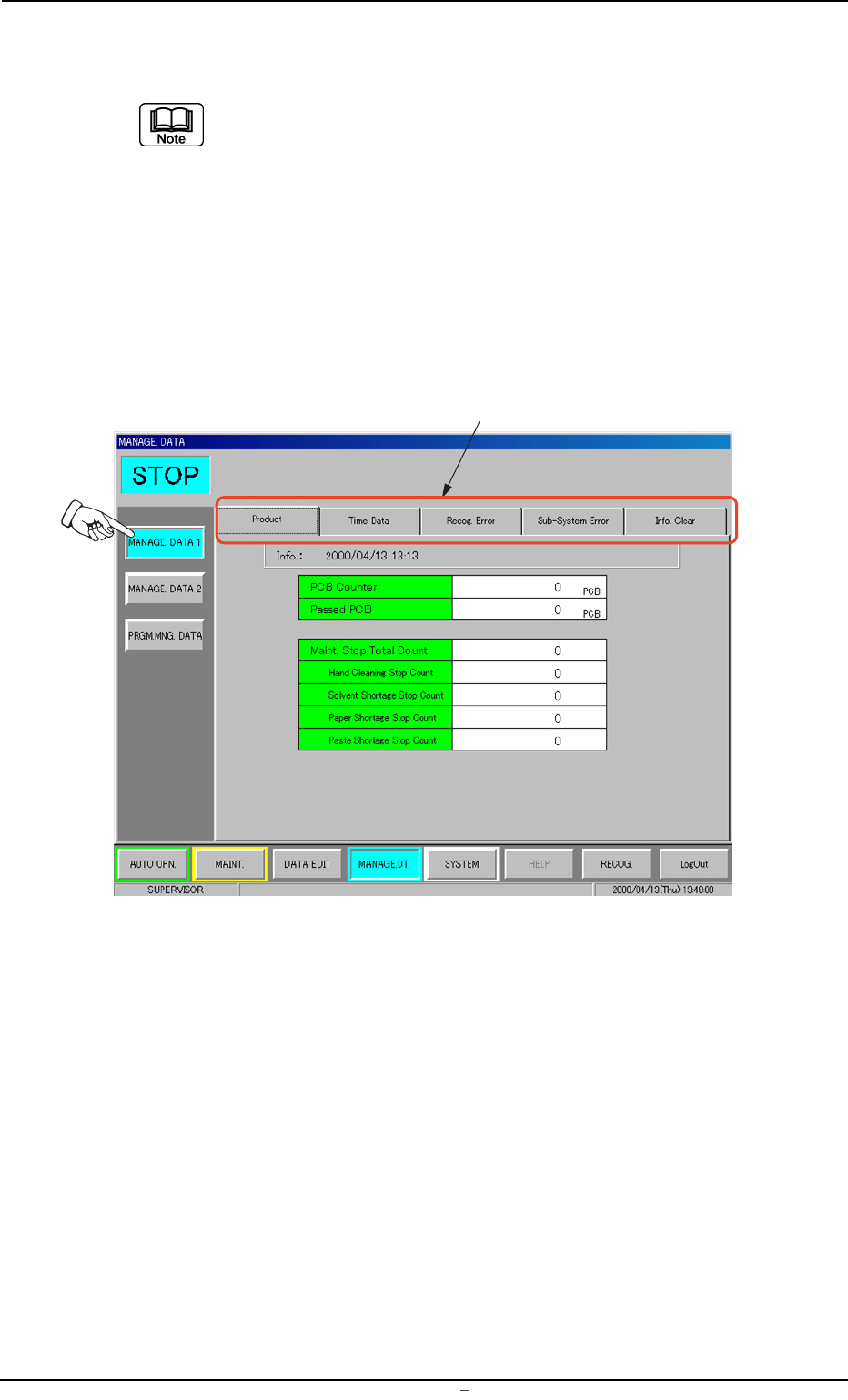 T able 3C1 T abs Description Product This indicates the data that represents the actual production rate of the machine. Time Data This indicates the data that represents the cumulative periods of running time for each op…