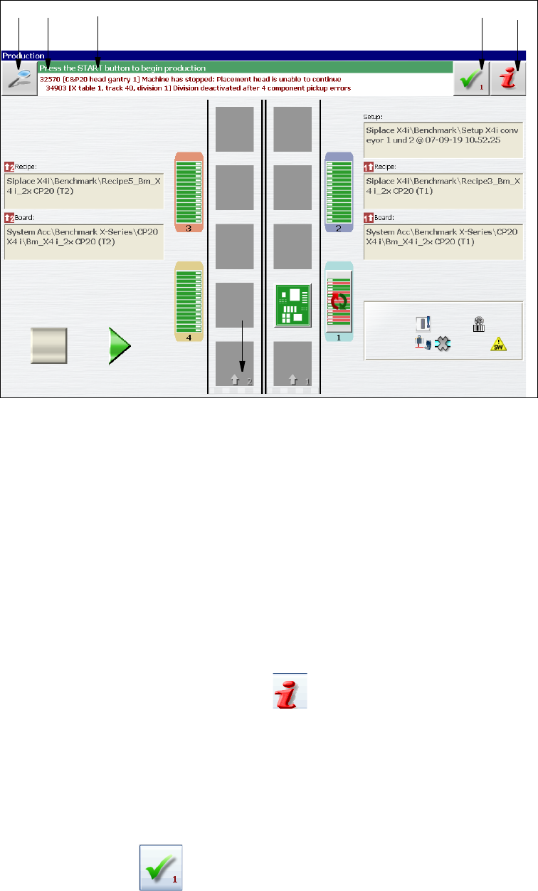 Fig. 5.6 - 1 Vederea "Producţie" cu mesaj de alarmă (pe exemplul SIPLACE X4i)