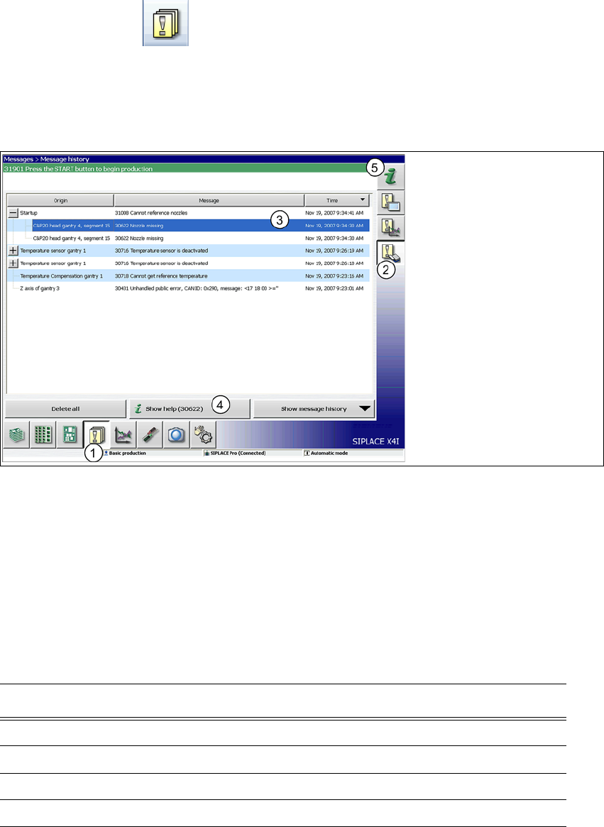 5 Sarci nile ma ş inii Instruc ţ iuni de utilizare SIPLACE SX1/SX2 5.6 Informa ţ ii ala rm ă ş i ajutor online Începând cu versiunea SR.706.1 SP1 Edi ţ ia 10/2014 246 5 Fig. 5.6 - 1 Vederea "Produc ţ ie" cu mes…