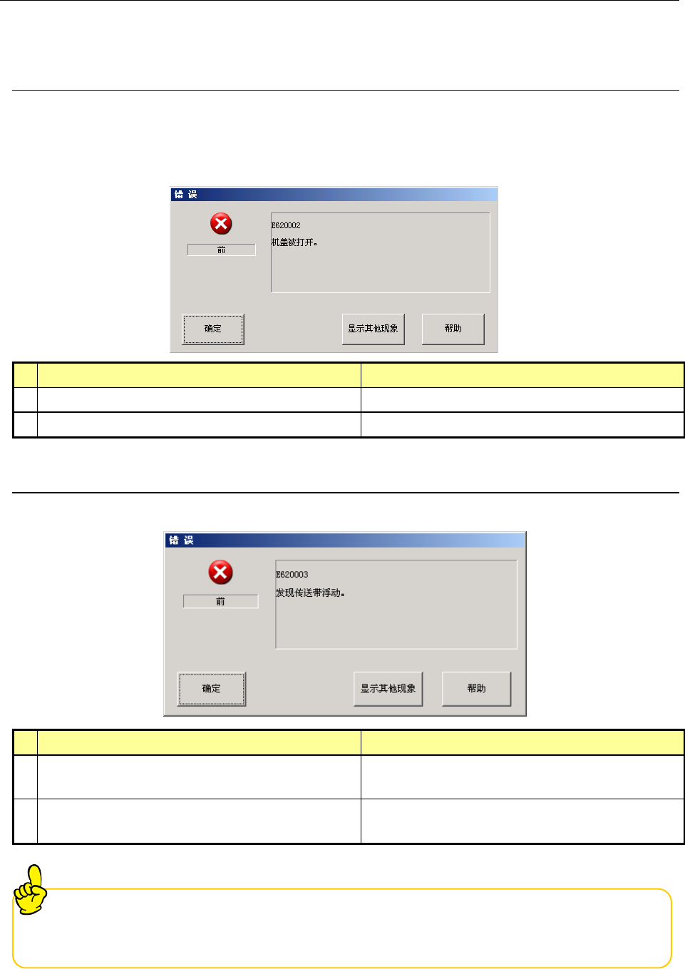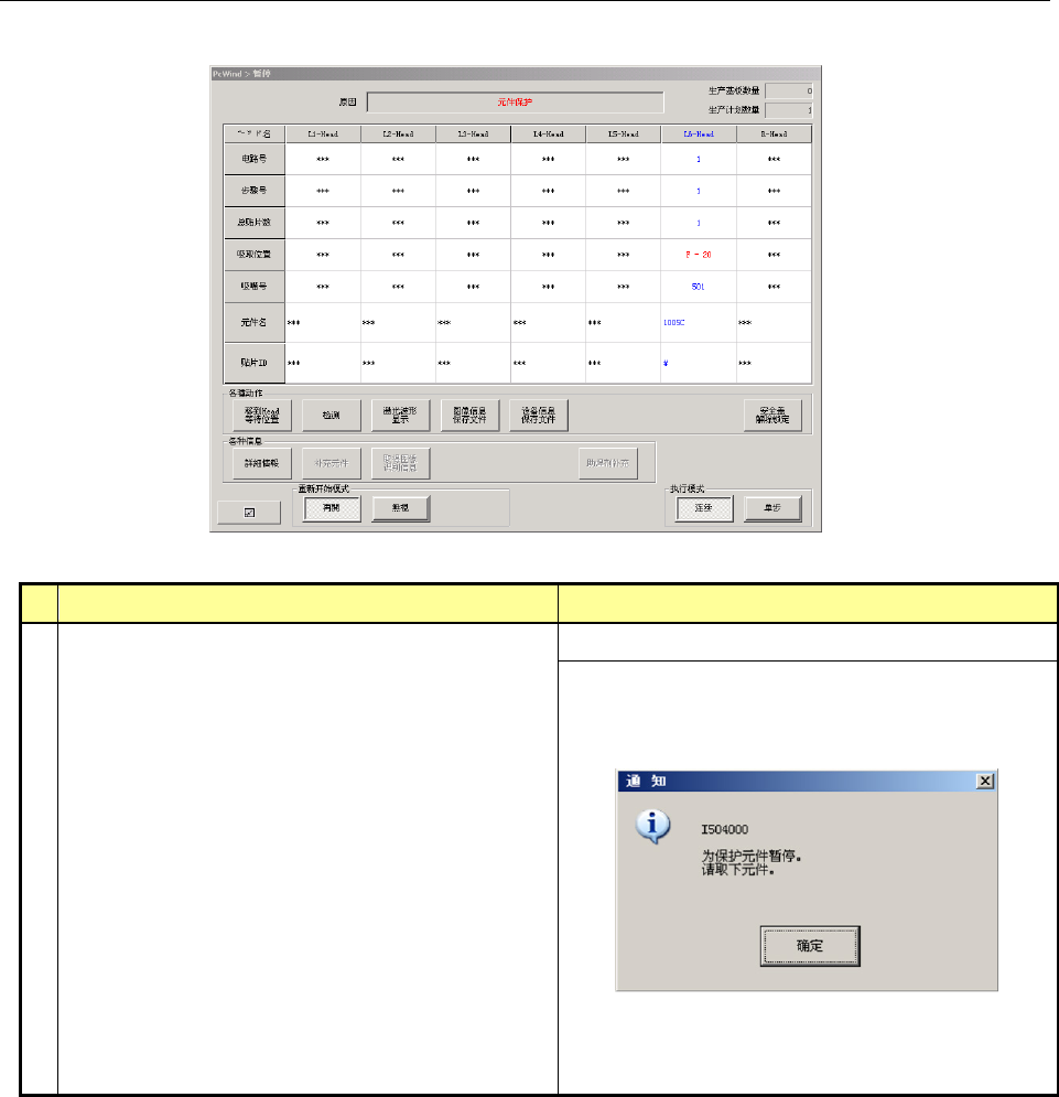 操作手册 5- 12 5- 11 生产时的 异常 结束 机械异常结束, 处于非 正常 停止 状态的状态 。 5- 11 -1 因打开安全盖生产异常结束 生产动作过 程中安全盖 处于锁 定状 态 ,「 安 全盖」是不能打开 的。 在安全盖解除锁 定的状 态下,生产动 作中打开安全盖 时 ,即 进入紧急停止状 态,生产 异常 结束。 * 「维护键」 在「维护 模式」时 ,会变为 暂停状态 。 原因 处理方法 1 生产运行中打开了安 全盖 执…