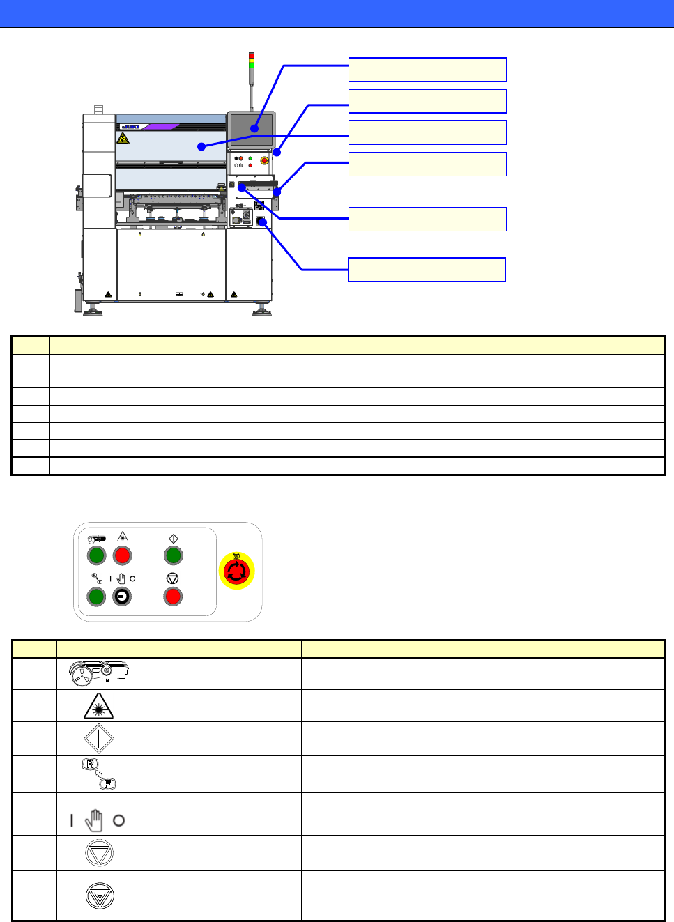 操作手册 2-2 2-2 本设备的构成 ▼ 主机 No. 名称 功能概要 ① 监视器 具备触摸式操作功能的液晶监控器。 显示各种操作画面,通过触摸画面进行操作。 ② 操作面板 集中了各种开关,可直接控制装置的运行。 ③ 安全盖 生产动作中防止手等伸入装置内。 ④ 带轨迹球的键盘 用于操作机器或输入数据。 ⑤ 供料器台架开关 供料器台架的升降开关(统一更换台车使用时) ⑥ 主开关 接通或切断设备的电源。 ▼ 操作面板 LASER ON N…