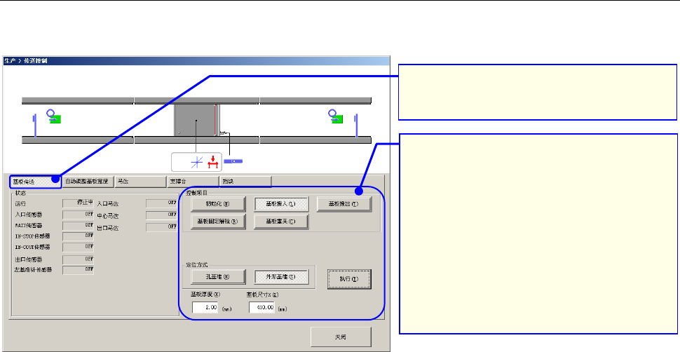 操作手册 3- 11 Ste p 5 - 2 在基板搬送画面 上执行基板 搬出。 请确认是否保持 与生产时的动作 同步传送基板 ,传送动作是否 有问题。 2. 把基板安装在 IN 缓冲,确认连续动 作时基板流动是 否顺畅。 选择 [ 基板搬入 ] -[ 执行 ] 后 , 基板即可搬 入、夹紧。 选择「基板搬出 」 - 「执行」 后,基板即可 搬出 。 1. 按下「基板传 送」按钮 , 即显示「 基 板传送」画面。