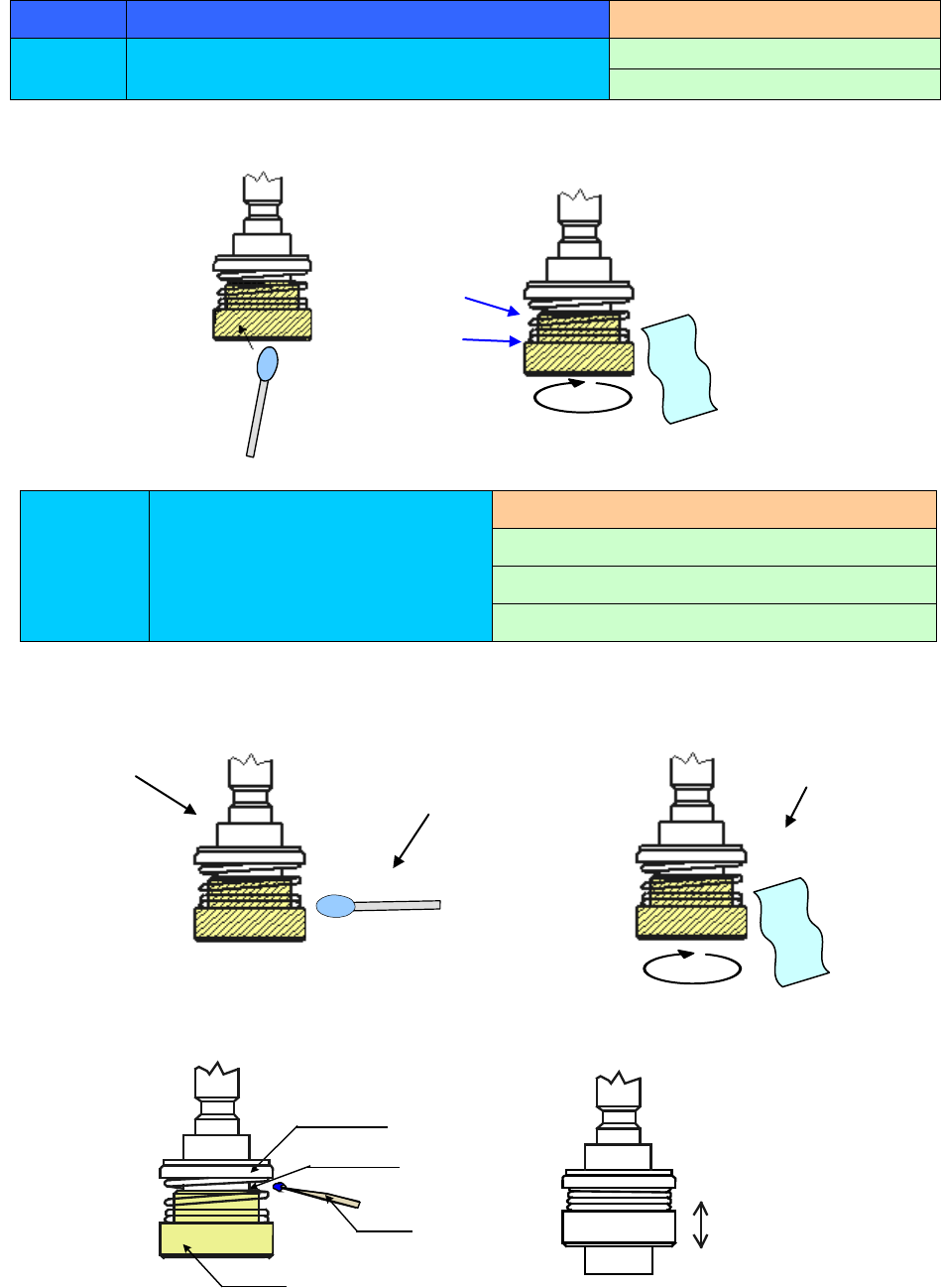 操作手册 4- 22 1) 用棉花棒浸湿酒 精,清扫吸嘴外 圈的内部。 2) 用酒精把吸嘴外 圈表面部分和弹 簧部分擦干净 。 1) 吸嘴外圈, 以及吸嘴外圈与外圈 弹簧支架之间 , 要用沾 湿油的棉 花棒进行 涂抹。涂抹后, 多余的油用气 枪吹掉,再用棉 纱布擦 干净。 2) 为使吸嘴外圈滑动滑 润, 请在涂抹黄油部 位上 (吸嘴外圈和外 圈弹簧支架的缝 隙部分) , 用牙签头等 沾 上米粒大的 6459 润滑油 N 进行涂抹 。 3…