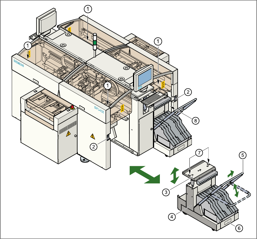 Üzemeltetési útmuta tó SIPLACE HS-50 4 AR-kezelés Software-verzió: S R.50x.xx Kiadás: 01/2006 HU 4.6 Cserélhet ő alkatrészadagoló asztal 137 4 4.6 - 2 ábra Az alkatrészasztal cseréje (1) Nyomógom b az A R-aszta llap fele…