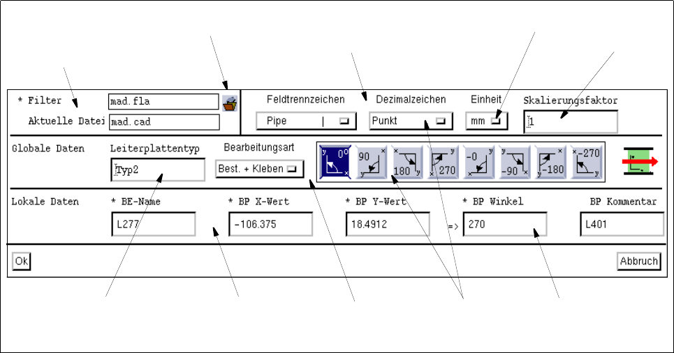 A “Filterdialog Leiterplatten” ablak több területre tagolódik. Az egyes területeken kiválasztó mezők (gombbal