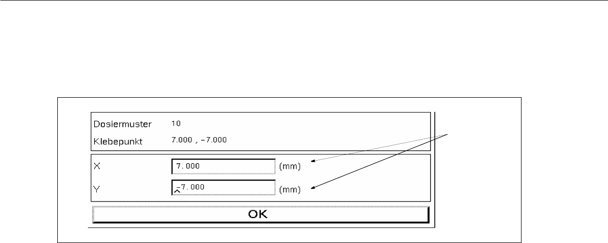 7.1.2 ábrát Ablak egy ragasztópont “x/y koordinátáinak beírásához” (“Eingabe der x/y-Koordinaten”)