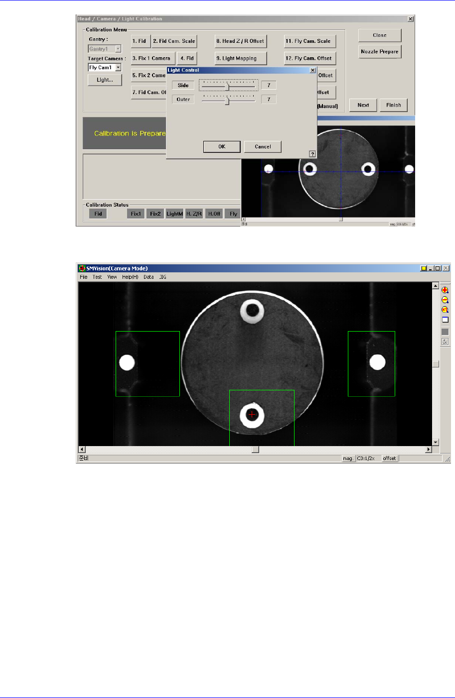 Samsung Component Placer SM41 1 Service Manual 3-58 7. 校正首先识别 Head 的 Reference Fiducial Mark 测量 Fly-Camera 的 R Offset 。之后用 Fly-Camera 识别校正 To o l 底面的 Fiducial Mark 2 点测量 Fly-Camera 的 Scale 值。 8. 自动执行 Calibration 后完成 Cali…