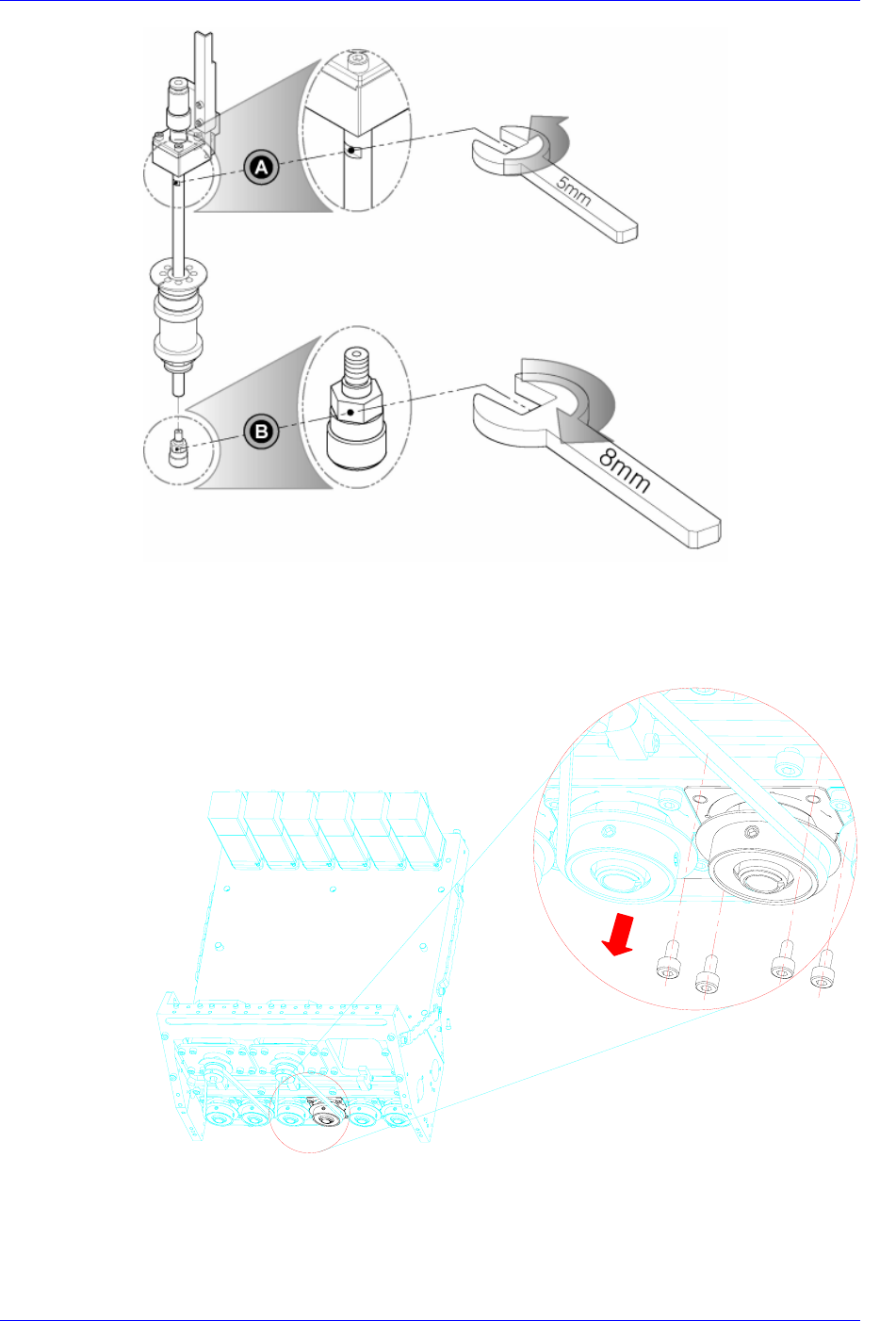 5. 用5mm扳手扣住Spindle槽(A). 用8mm扳手扣住喷嘴Holder的六角部分(B)