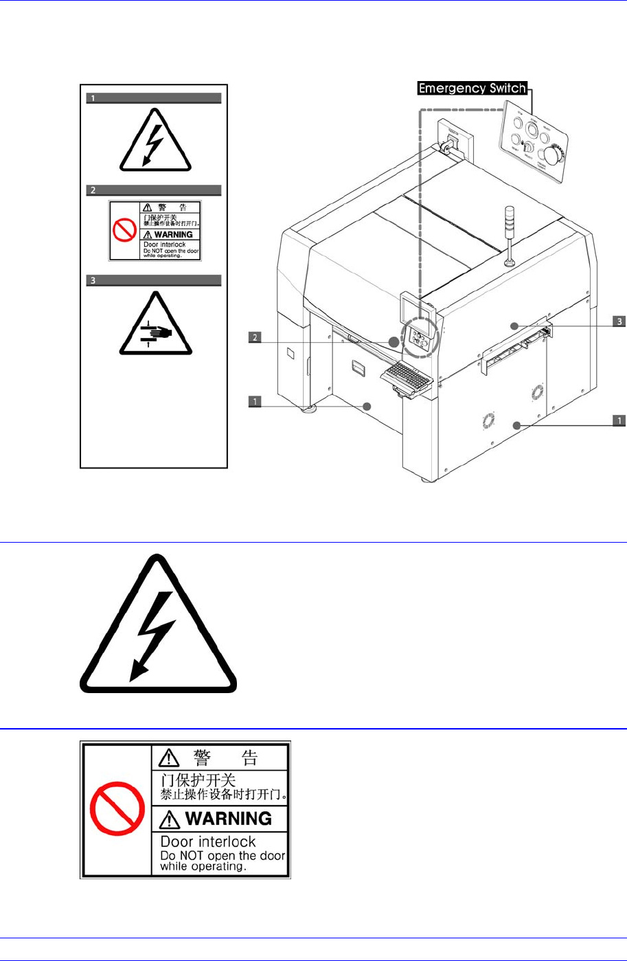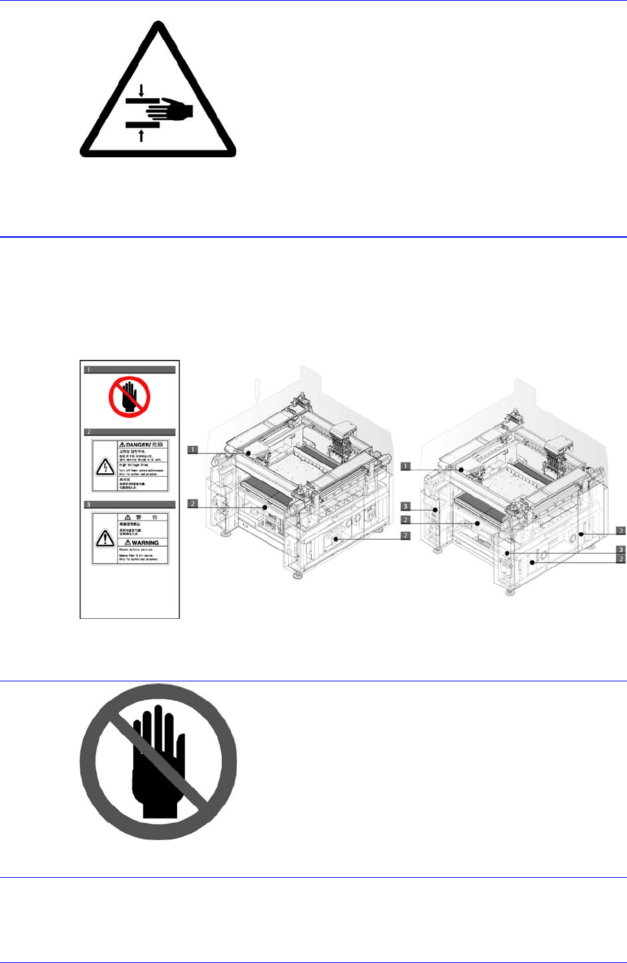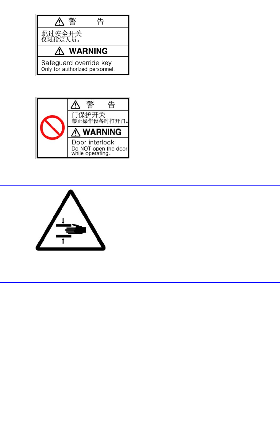 前言 v 设备后面 设备后面贴有以下标签 图 0-2. 设备后面的安全标 签 盖子内侧及周围连接物部 位存在高电压要注 意电击危险。 在维护和修理设备操作时 一定要先切断主电 源。 运行中禁止手触摸 贴有此标签的位置设置有移动体 ,在运行 时如果分解移动体或将盖子打开 ,身体某 部分伸入到设备内部是非常危险 的。
