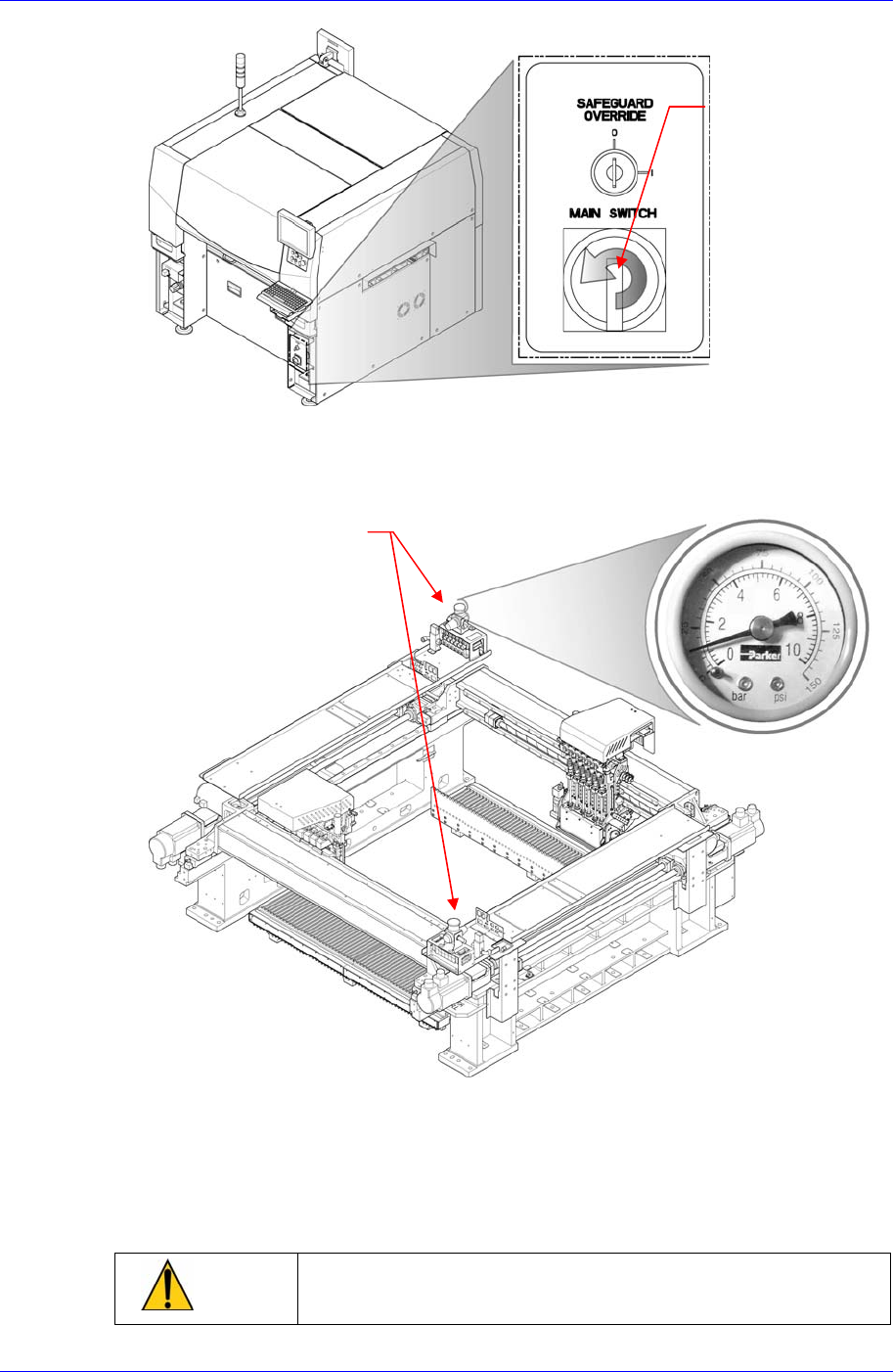 Head Module 4-89 4. 请旋转下图 Blow Regulator 的调节手柄把供应压 力提高到 “0.5Mpa” 为止。 5. 用手按住 1 号转轴的 slide body 最大限度下降后,在喷嘴座下 端垫上干净布块 , 1 0 次以上反复按作用于 Head Air 程序的相应转 轴手动按钮。 6. 同样地反复 2 号转轴 ~ 6 号转轴。 7. 转动 Blow Regulator 的调节把儿,供给压力调回原来的 0.1…