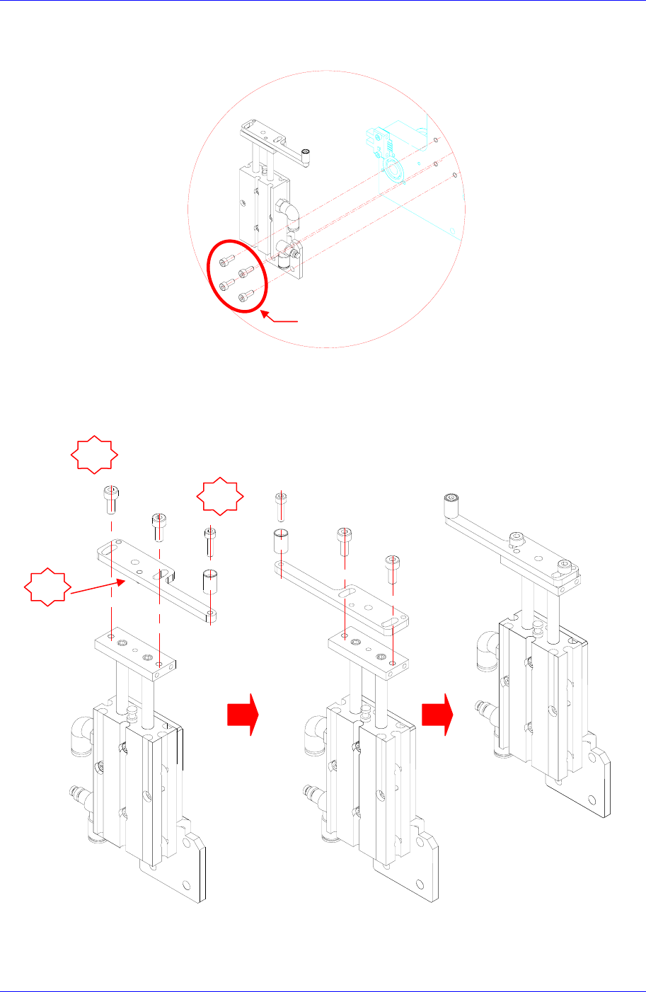 Conveyor & BUT 5-41 13-1 拧开固定 Stopper Cylinder 的固定螺丝 (M3-4 个 ) 后,如下图进 行分离。分离出的 Stopper Cylin der 组装在 W ORK REAR FIX 侧。 13-2 同上图的方 法从 W ork Front Fix 中分离出的 Stopper Cylinde 如 下图拧开 1 号 固定螺 丝后, 2 号 Bracket 旋转 180 度进行再组装。…