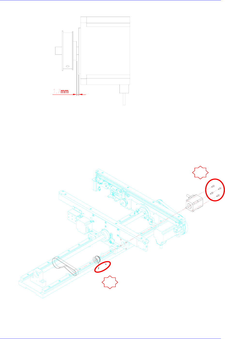 3. 更换马达后进行组装时,马达和滑轮之间的间距同下图设置成1.7mm。最后组