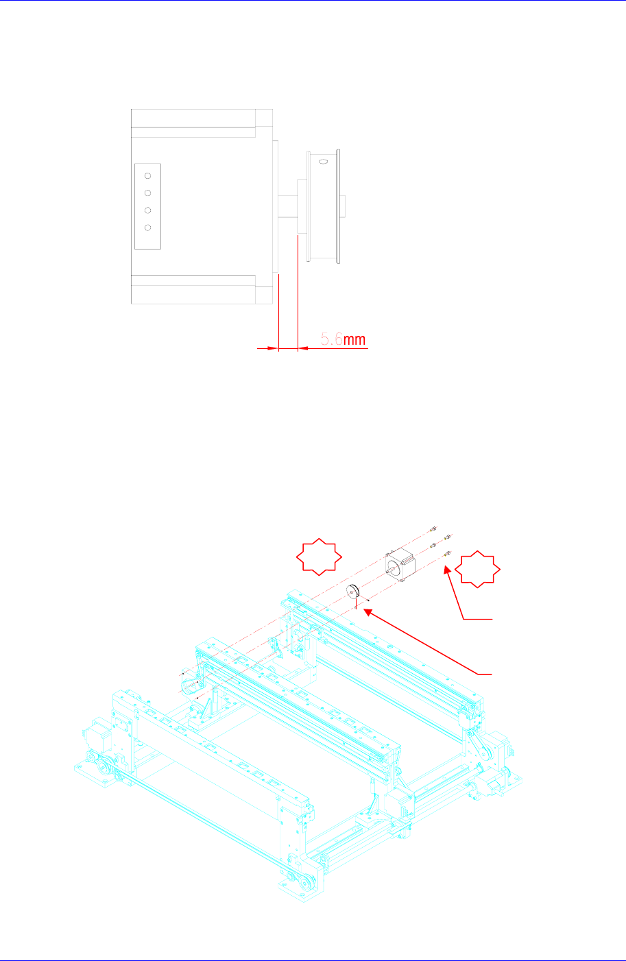 3. 更换马达后进行组装时,马达和滑轮之间的间距同下图设置成 5.6mm。最后组