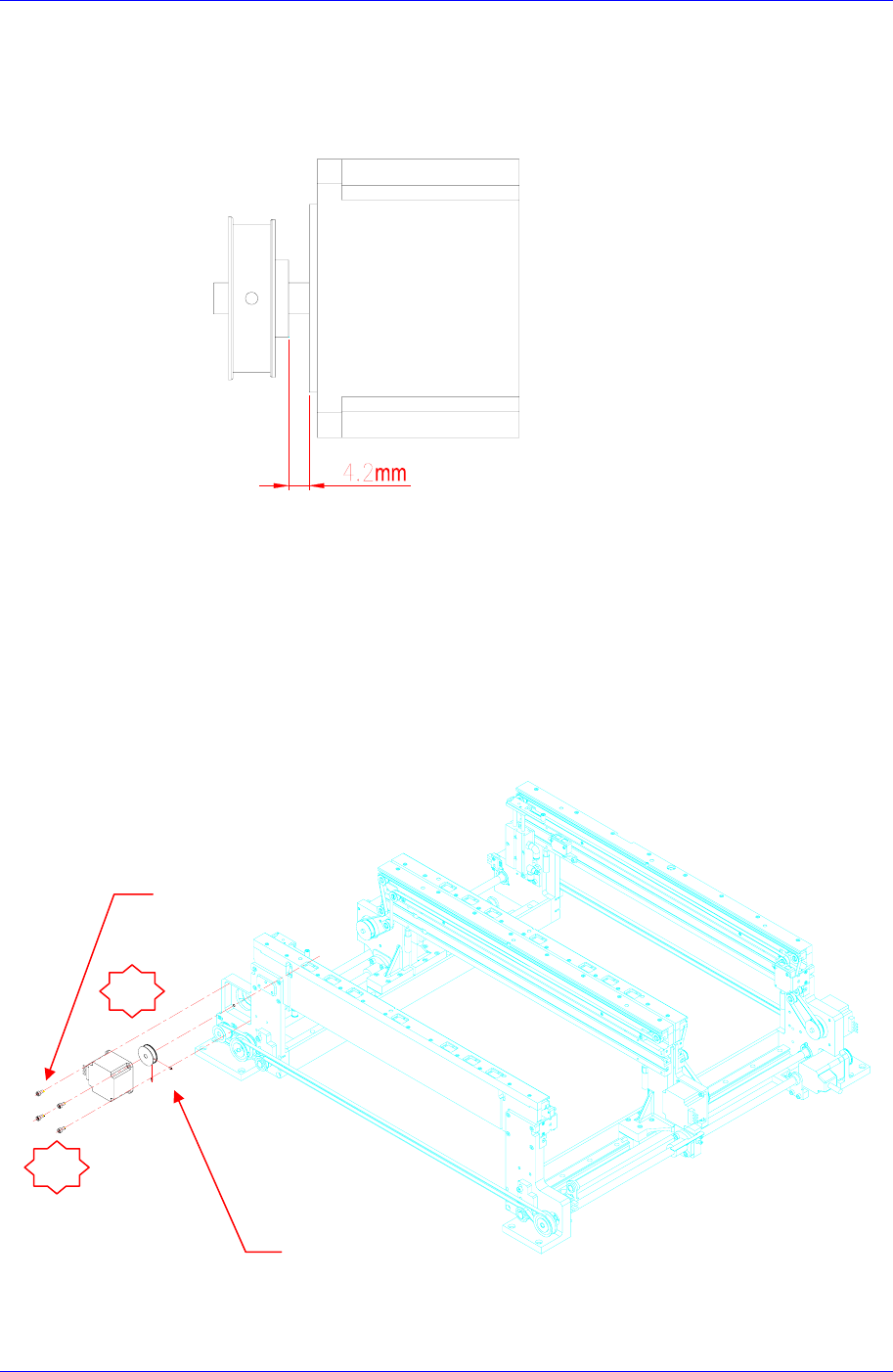 3. 更换马达后进行组装时,马达和滑轮之间的间距同下图设置成 4.2mm。最后组