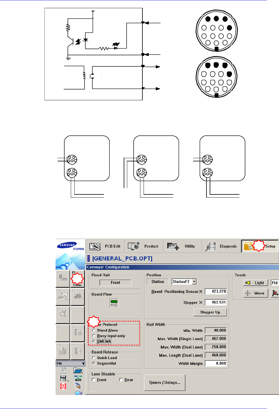 Samsung Component Placer SM41 1 Service Manual 2-20 à 选择 SYS.SETUP 菜单,再选择 Conveyor 子菜单。 à 在 Inline Protocol 领域的 In(Before) 和 Out(After) 组 合框选择 Stand Alone, SSA T ype(2 接点 ) , SMEMA 中的一个。 - Stand Alone : 未作出设备间连接,手动作业时 设置…