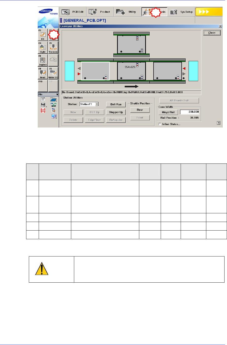 3. 在‘Conveyor Utilities’对话框投入PCB,确认各Station的基板检查传感器及其他