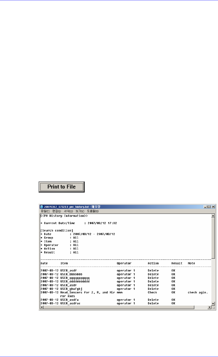 Samsung Component Placer SM41 1 Service Manual 14-34 14.5.6. History 画面 在 History 画面中可查看所有检查 记录。 图 14-15. History 画面 查看检查记录时,输入检查条件 后点击 <Search> 按钮。 图 14-16. 检查记录查看画面