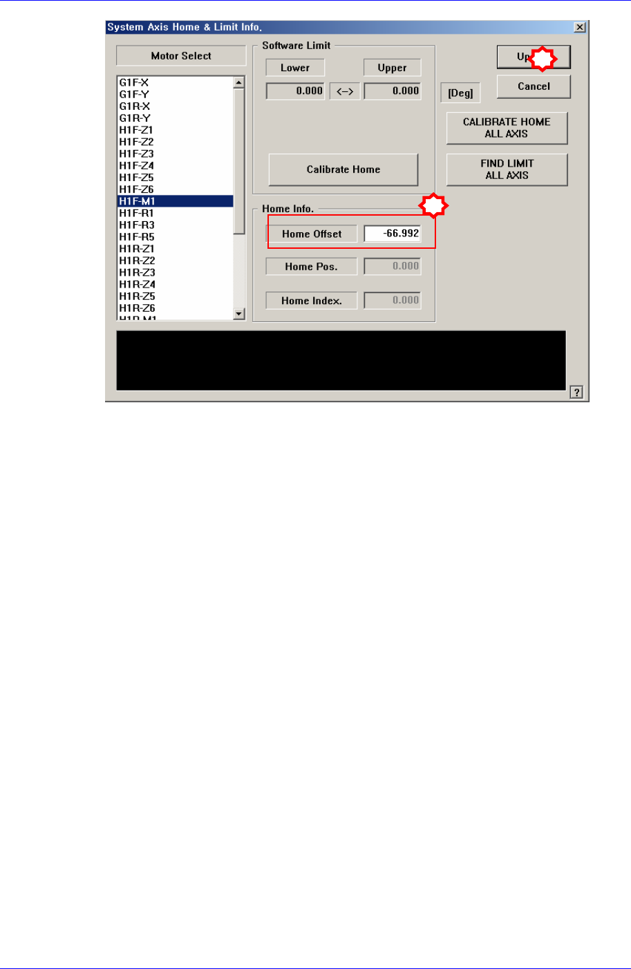 Calibration 3-5 10. 完成后,点 击 <Update> 按钮反映变更值。 11. 然后若显示 是否执行设备初始化 (Homing) 对话框,请选择“ 否 (N) ”。 12. 利用示教框 执行设备初始化 (Homing) 。 1 2