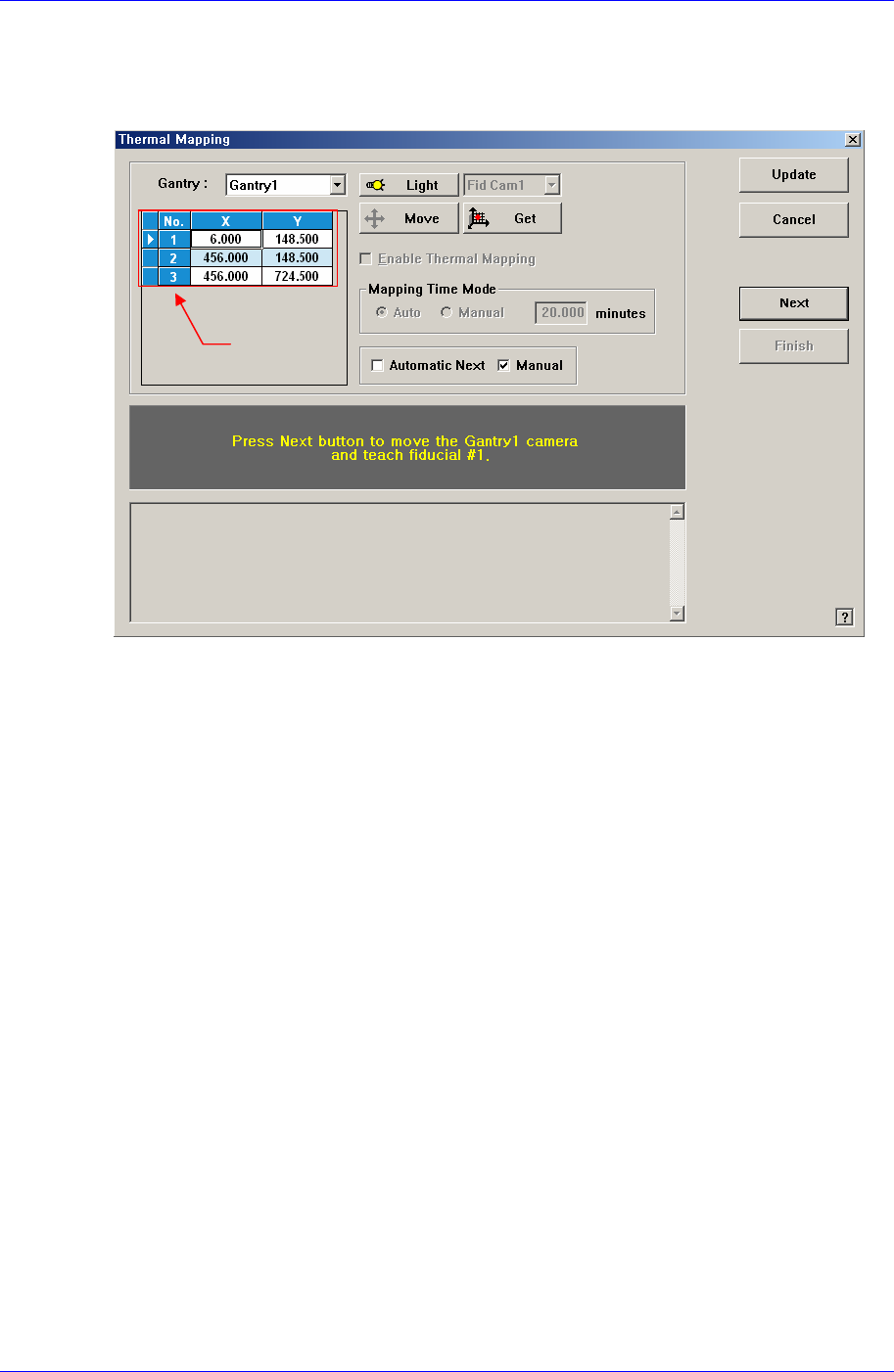 Calibration 3-29 选定后进行校准,将显示执行结果而把储存,可以 与之前数据比较后检查当前 设备的变化情形。 3.2.7.1. Procedure 手动执行 Gantry Thermal Mapping 步骤如下 ; 1. 参照下图示教位于传 送带上面的基准点 3 点的位 置。 ① ② ③ Gan try 1 Mar k 위 치 ① ② ③ Gan try 2 Mar k 위 치 2. 点击 <Move> …