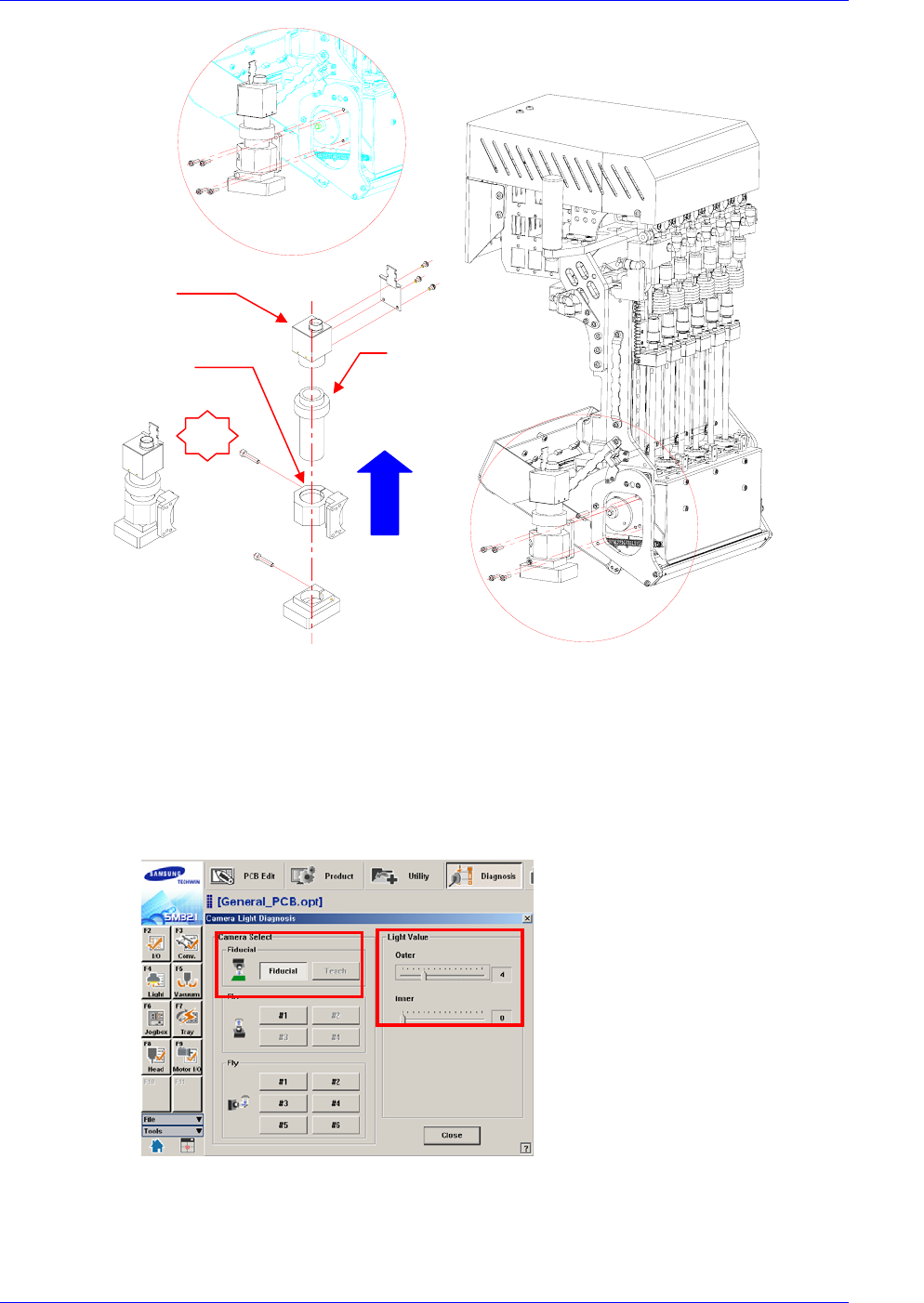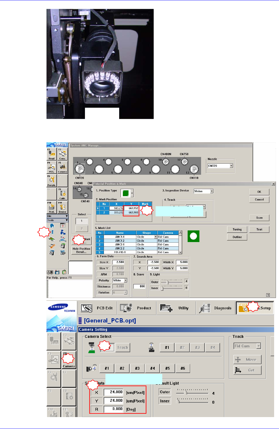 Head Module 4-93 5. 请按拆卸的逆序进行组装 . 组装时 , 利用固定螺丝,把摄像机夹具和摄像机组 装在一起,固定在摄像机 Bracket 。此时,拧松固定螺丝 ,连接影像电缆。 6. 作业完成后,打开设备前面的 Main Switch ,启动 PC 。然后边看 ‘SMV ision’ 窗 利用夹具或 , 者与前面固定输送机 架子平行,对准摄像机十 字线。 7. 请确认摄像机照明状态。 (Outer 照明 ) CAME…