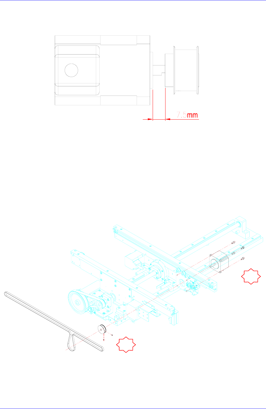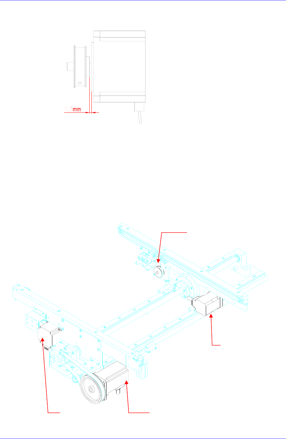 3. 更换马达后进行组装时,马达和滑轮之间的间距同下图设置成1.7mm。最后组