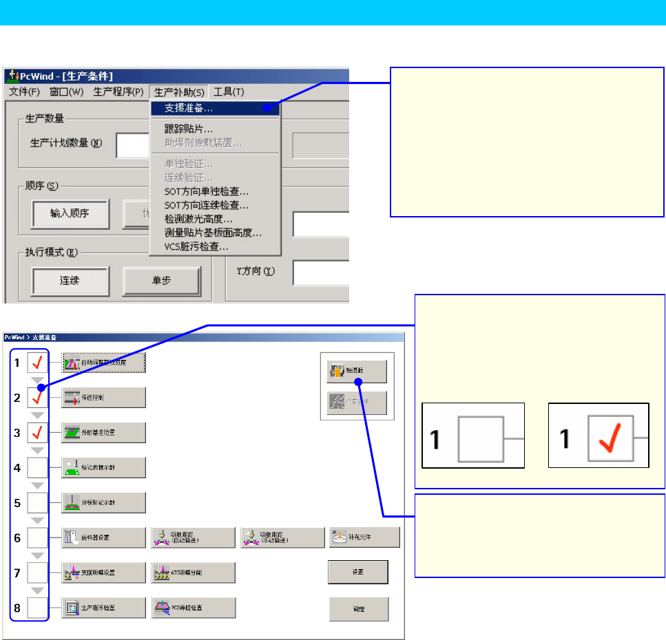 可以使用「支援准备」功能,边确认步骤,边进行生产准备。