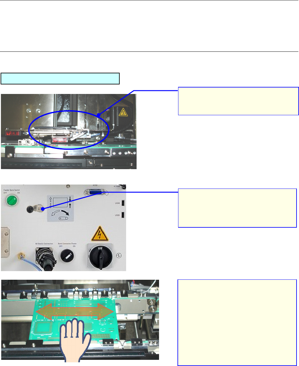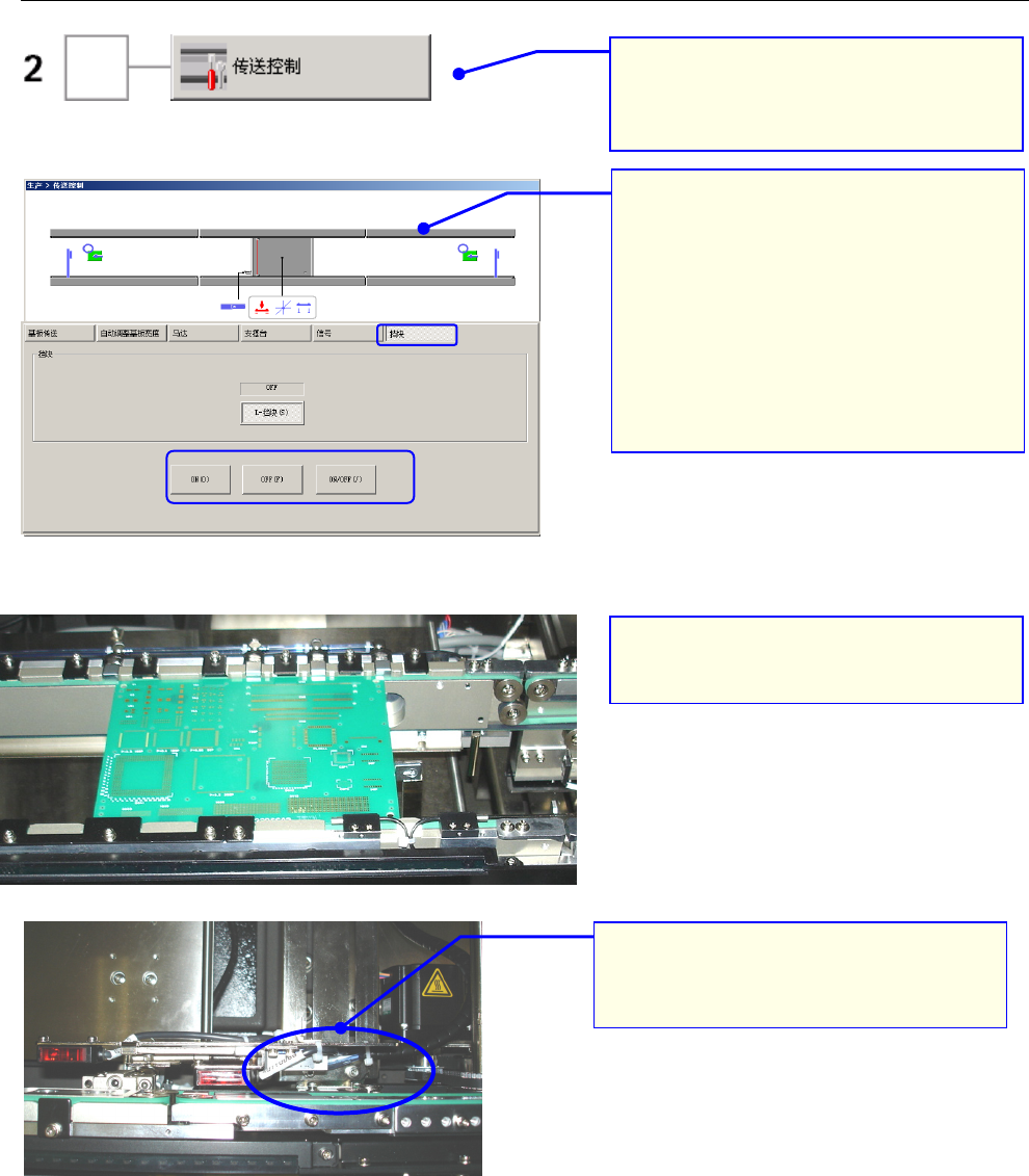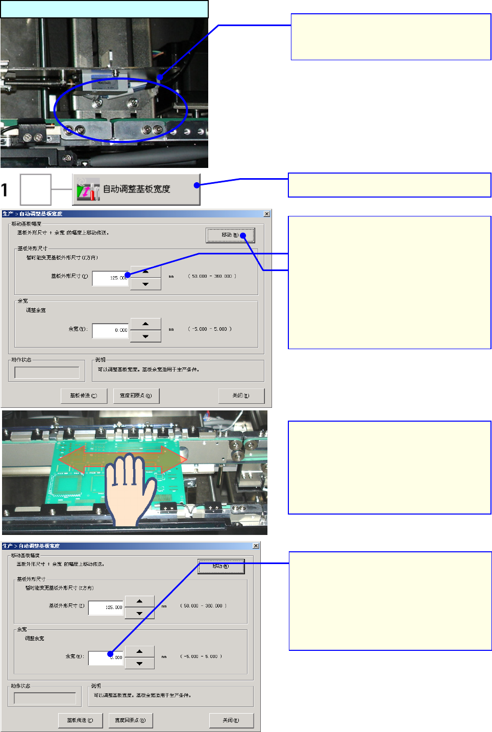 操作手册 I 3-8 3. 显示「自动调整基板宽度」画面。 ①确认设置的尺寸 ②按下[移动(M)]。 (要执行 「移动」 、 而尚未执行 「宽度回 原点」 时, 请按提示, 先执行返回原点。 ) 4. 把基板放在传送带上, 确认轨道宽 度。 *请确认在整个传送轨道上基板的流 动是否顺畅。 5. 传送轨道宽度太宽、 或太窄时, 请 调整 「余宽」 后, 再按下 [移动(M)] 按 钮。 *请把基板和轨道的间隔,调整为 0.5~1.0m m…